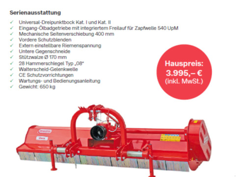 Heckanbau Schlegelmulcher Maschio BRAVA 250 zum HAMMERPREIS! Zahlreiche Maschinen an unterschiedlichen BayWa - Technik - Standorten, ab Frühjahr 2026, pünktlich zum Saisonstart, verfügbar. Fragen Sie noch heute an, direkt bei Ihrem BayWa - Technik Ansprechpartner vor Ort und sichern Sie sich Ihre ganz persönliche Maschine zum Vorteilspreis! Alle Maschinen in Serienausstattung. Bitte die Produktbeschreibung in den Bildern beachten. Aufpreispflichtiges Zubehör kurzfristig nachrüstbar. Achtung: Die Beispielbilder dienen nur zur Veranschaulichung und können vom original Angebot abweichen!