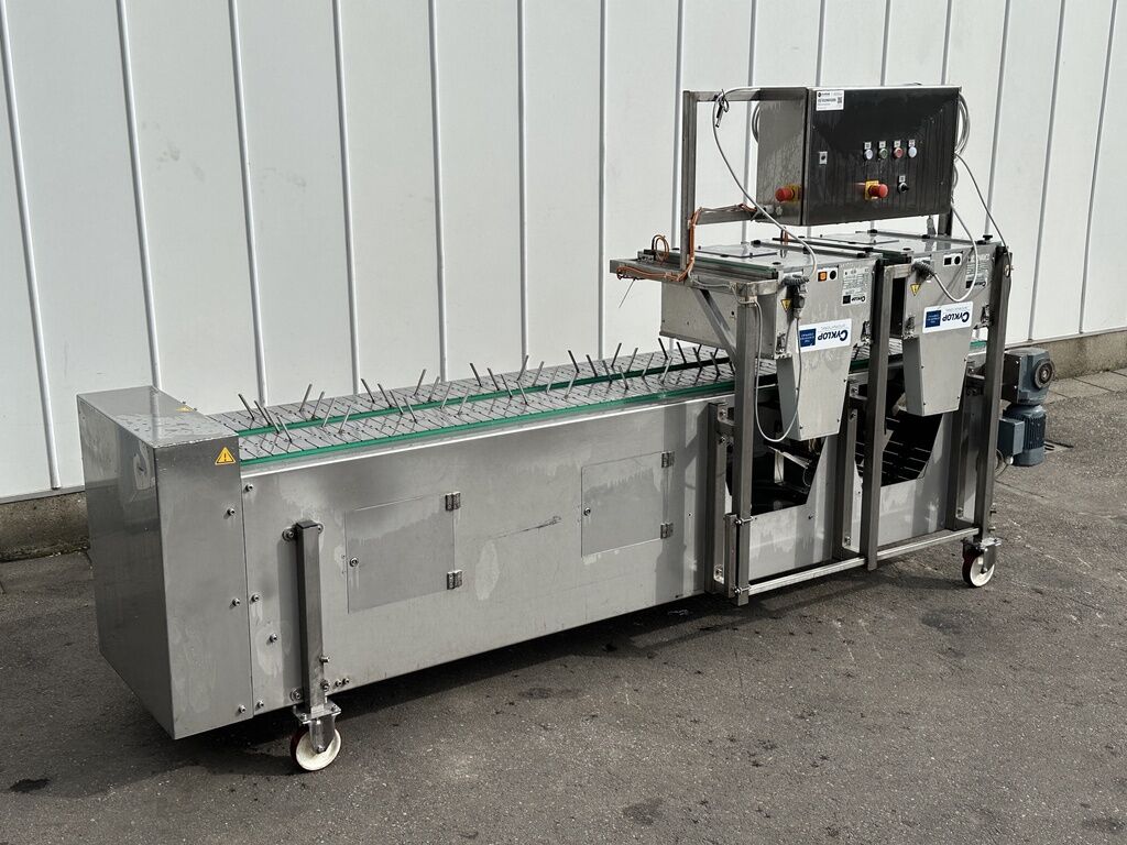 Dieses System wurde speziell für das Bündeln von automatisch geernteten Bundmöhren mit Grün entwickelt.Aufgrund der großen Menge an Schmutz ist die Bindemaschine über dem Produkt installiert. Diese Maschine kann auch zum Bündeln von Lauch, Rhabarber, Spargel, Kräutern und anderen Produkten verwendet werden.Die Funktionsweise der Maschine: Die Bündel oder verschiedenen Gemüse werden zwischen Tragegabeln gelegt. Diese Aufnahmegabeln sind auf zwei Förderketten montiert. Das Produkt wird zur Bindemaschine transportiert und automatisch gebündelt.Gesamtlänge der Maschine 3 Meter Freq. geregelt Mit 2 Axro-FQC2-L-MD35-RVS-TS-PLC-SK Edelstahlbindern, kopfüber installiert und bindend, speziell für nasses Produkt Produktträger auf einer EdelstahlketteArbeitshöhe 700-900 mm Elektrischer Anschluss 230 Volt Aufnahmeleistung 2 Kw36 kg Elastik grün 2KWeitere Informationen oder eine vollständige Angebot? Fragen Sie das einfach und schnell an auf unsere Duijndam Machines Website! Sie können uns auch anrufen.Alle zuverlässigen Maschinen finden Sie auf unserer Website.Seit 40 Jahren zuverlässiger Händler von gebrauchten Landwirtschafts- und GartenbaumaschinenDie Maschinen werden vor Auslieferung geprüftErfahrenes TeamWir können Ihnen helfen, die Maschine zu Ihrem Unternehmen zu TransportierenDuijndam MachinesDer Spezialist in Gebrauchtmaschinen für Landwirtschaft und Gartenbau