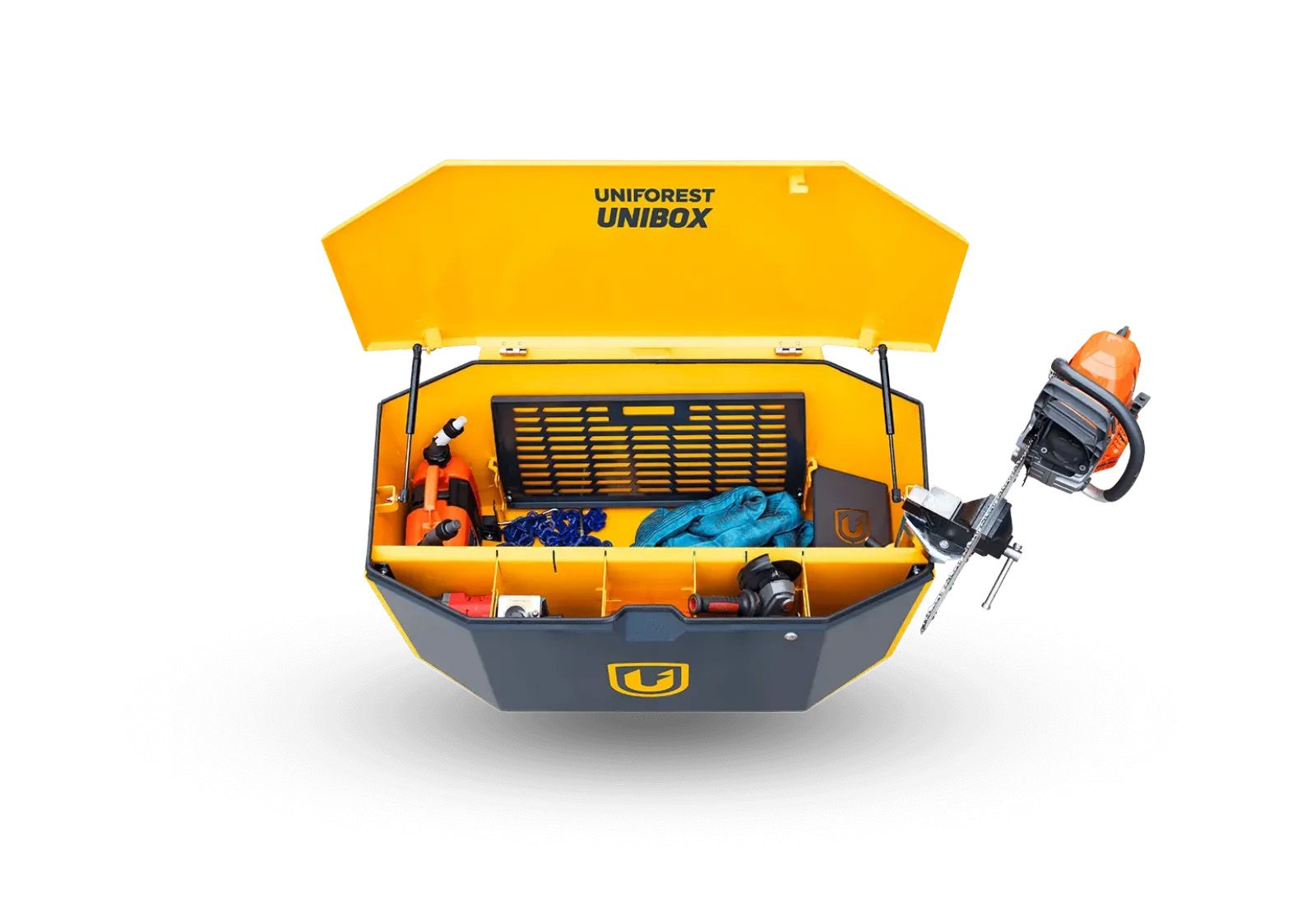 Die Uniforst UNIBOX wird als multifunktionales Anbaugerät für Traktoren hauptsächlich zur Aufbewahrung und zum Transport von Werkzeug und Material zum Einsatzort im Wald oder auf dem Bauernhof verwendet. Zusätzlich zu ihrer Funktion als Werkzeugkiste wirkt sie als das Gewicht an der Vorderseite des Traktors und erleichtert die Arbeit mit Traktoranbaugeräten. Das Design sorgt nicht nur für