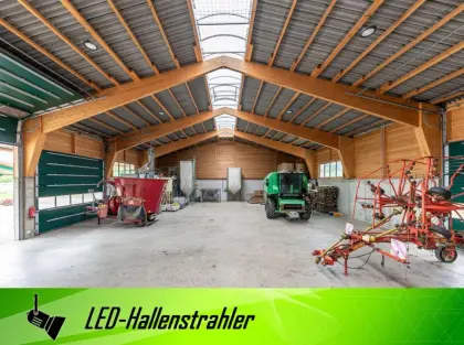 Das richtige Licht für Hof, Halle und Stall. Technische Daten: 300, 500, 800, 1.000 Watt Strahler, 25.000 - 110.000 Lumen je Watt, Aludruckgussgehäuse mit Kühlrippen