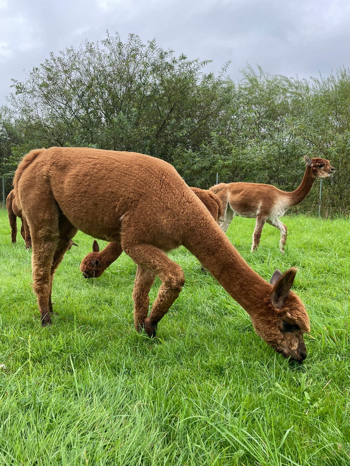 Fritzi ist eine Stute aus unserer eigenen Zucht. Sie hat ein sehr feines, dichtes Vlies mit 15,2 mic., SD-Wert von 3,1 mic. und einen Comfortfaktor von 100 %! Ihr Vater ist AVW Pogy's Avatar, ein Enkel von AHL Peruvian TruHighlander, vielfacher Champion und "Best of Show". Avatar hat bei verschiedenen Shows in den letzten Jahren stets 1. und 2. Plätze belegt, sowie einen Reserve Color Champion gewonnen. Ihre Mutter Carla ist eine tief dunkelbraune Stute unserer eigenen Zucht. Bei Interesse können Fritzi gern auf dem Hof besichtigt werden. Geb.: 24.05.2022, Vater: Pogy's Avatar, Enkel von AHL Peruvian TruHighlander - vielfacher Champion, Mutter: APE Jamal's Carla.