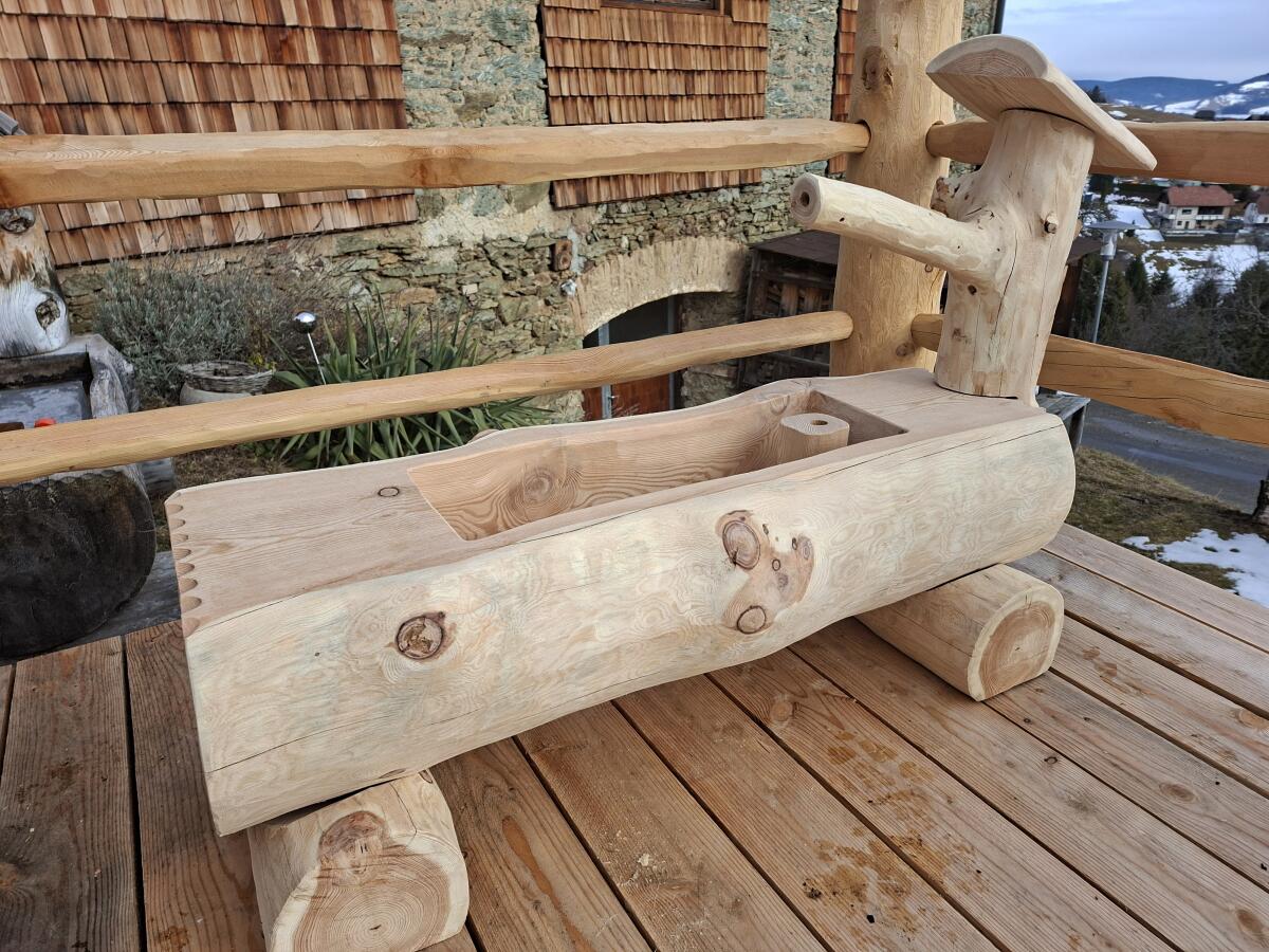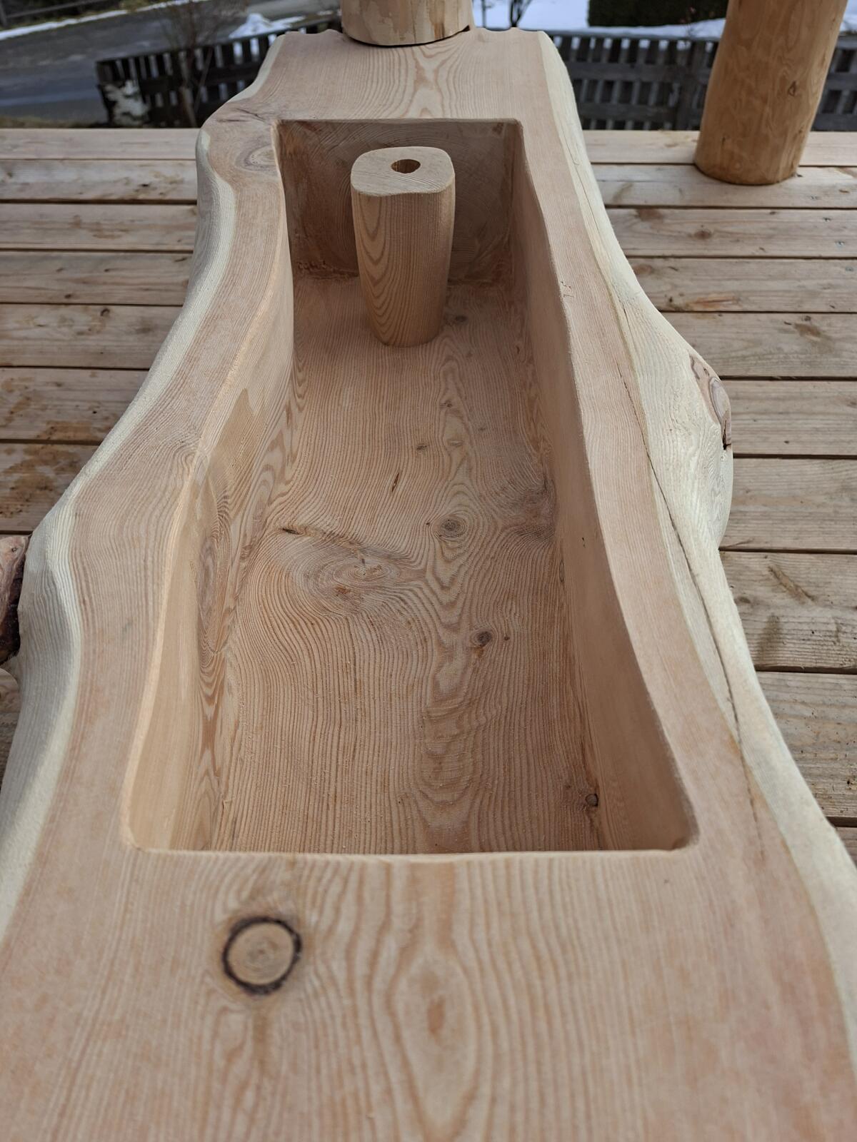 Regionale Kärntner Gebirgslärche. Länge Trog 93 cm. Stammdm. 30 cm. Wassermaß L53 B16 T11 cm. Kann auch ohne festen Wasseranschluss durchgehend betrieben werden. Mit Solar, Pumpe und Schlauch inkl. € 50. Zustellung nach Entfernung gegen Aufpreis möglich.