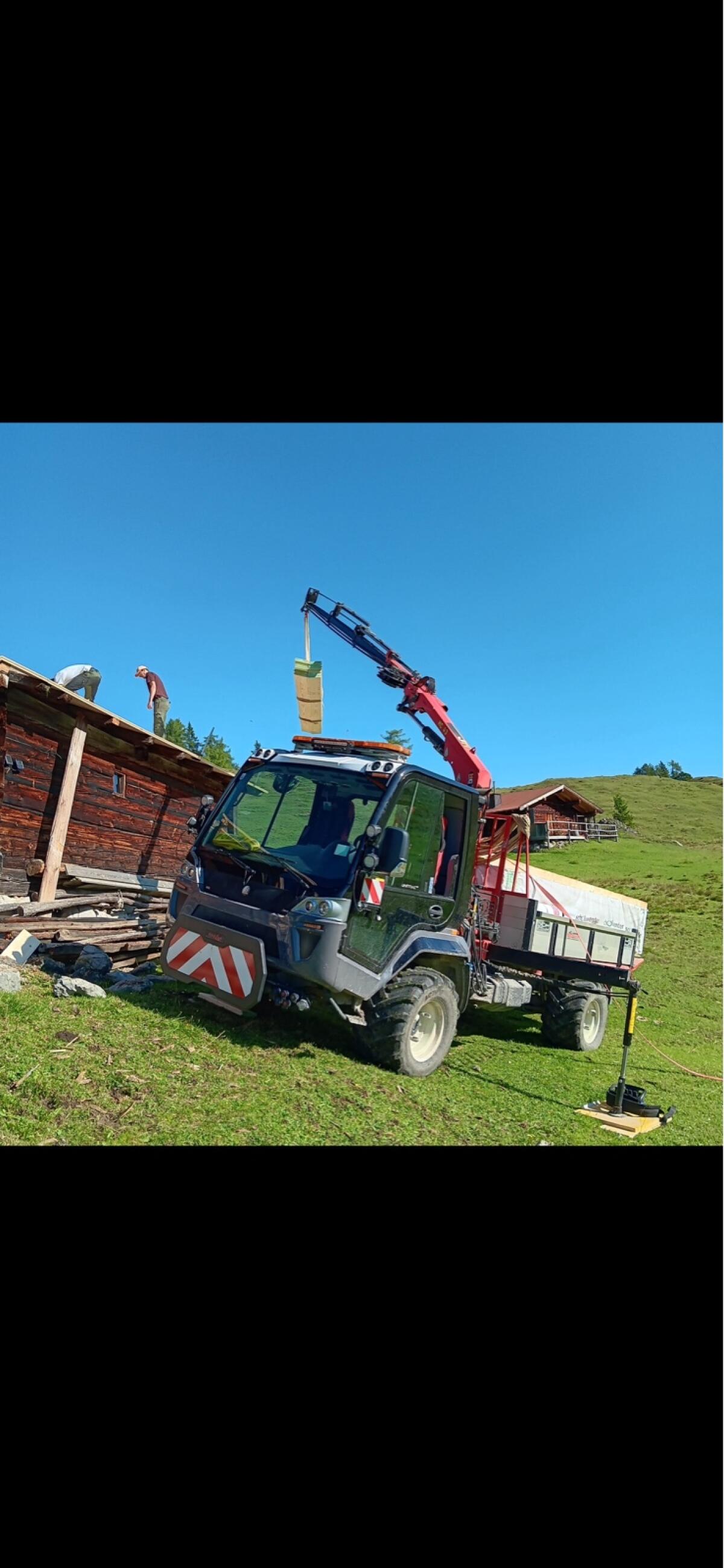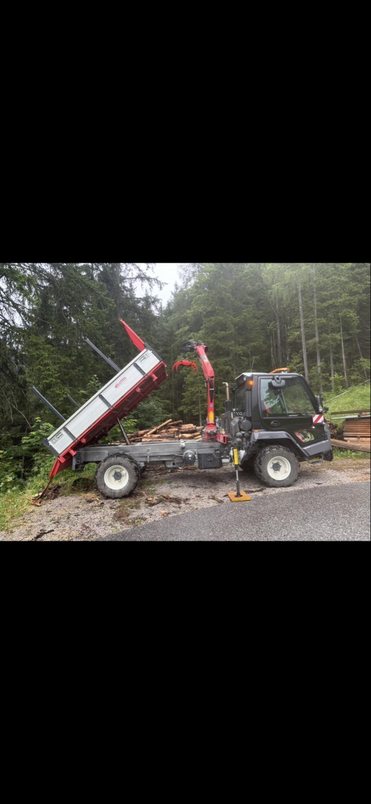 Dreiseitenkipper mit Kranaufbau für Lindner Unitrac mit langem Radstand, Pritschenmaß 2,8 x 2,0 m, Boden aus Hardox, Stangenträger vorne, Bordwände aus Alu mit verstärkter Kante, hydr. Heckklappe, 4 steckbare Rungen, Unterfahrschutz mit Beleuchtung, Kennzeichenhalterung, automatische Anhängerkupplung, Pkw-Anhängerkupplung, Zapfwellendurchtrieb, Eigenölversorgung mit Gusspumpe, Zapfwelle an Heck bei Kranbetrieb möglich, Ladekran HC43A3, schwenkbare Abstellstützen, Greifer und Rotorsteuerung, Funkfernsteuerung Scanreco mit 2 Akkus, 4-fach Schwenkwerk, Forstgreifer 1,2 m mit Rotor, Schalengreifer 250 l mit Rotor. Zustand neuwertig.