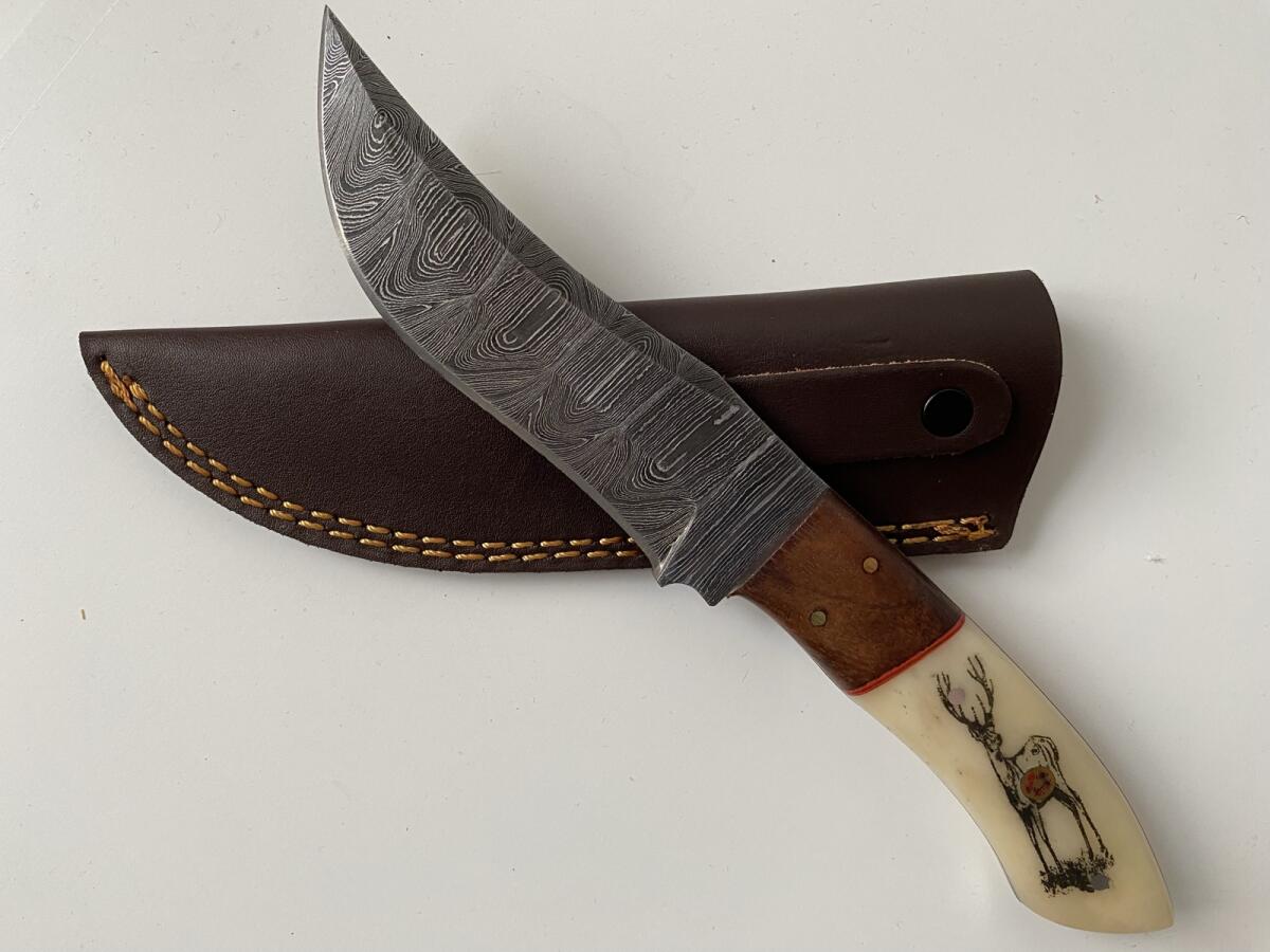 Handgemachtes Damastmesser aus Edelstahl und Kohlenstoffstahl, 176 Lagen. Härte 55-58 HRC Rockwell. Mit Lederscheide, 23 cm. Messer ist unbenutzt und neu. Privatverkauf, keine Garantie und Gewährleistung oder Rücknahme.