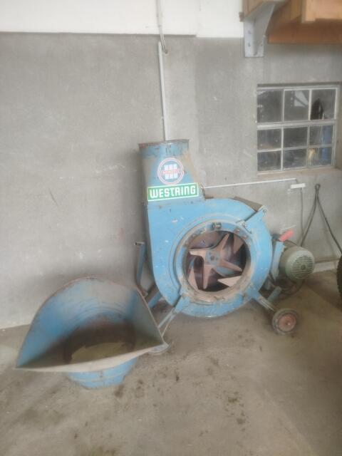 Kirchner Heugebläse Flottweg mit Motor 7,5 kW, Rohren, Schellen und Auswurf.