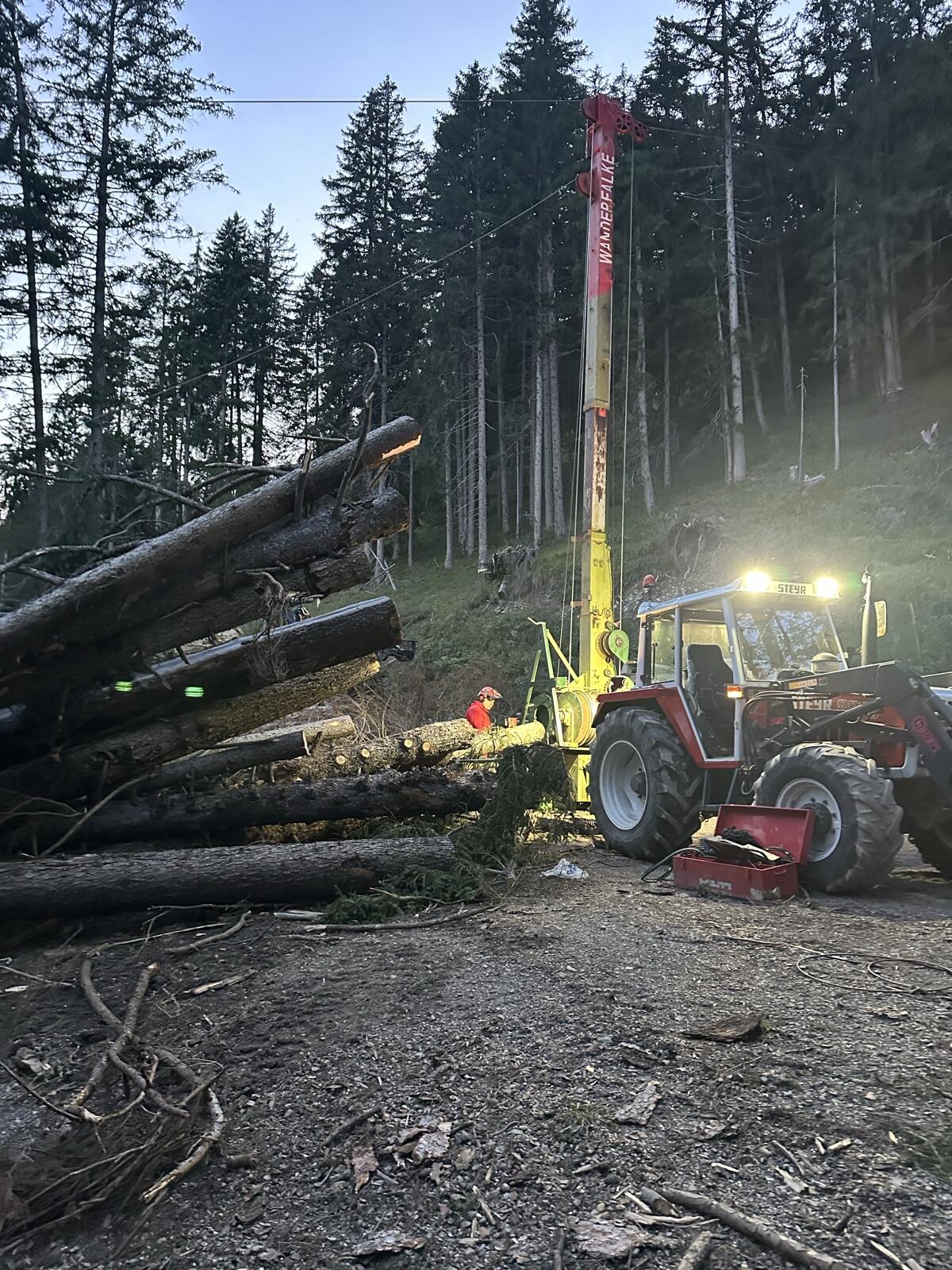 Ich verkaufe ein Vst Wanderfalke: 8mm Zugseil 450m lang, 14mm Tragseil 450m lang, 6mm Hilfsseil 300m lang. Hilfswinde kann bis 1.200m Seil bestückt werden. Gemessene Zugseilkraft beträgt 2,5t erste Wicklung. Voll hydrostatisch und wird mechanisch gesteuert. Antrieb: Traktorzapfwelle, ab 50ps. Gesamtgewicht: 3,5t ohne Laufwagen. Masthöhe: 7,6-9,5m ausschiebbar. Bergab 230m, Bergauf 450m. MM Sherpa 1,5 U mit Zwangsausspulung. Kann als 2-Seiler oder 3-Seiler betrieben werden. Bei Fragen einfach nach meiner Nummer fragen.