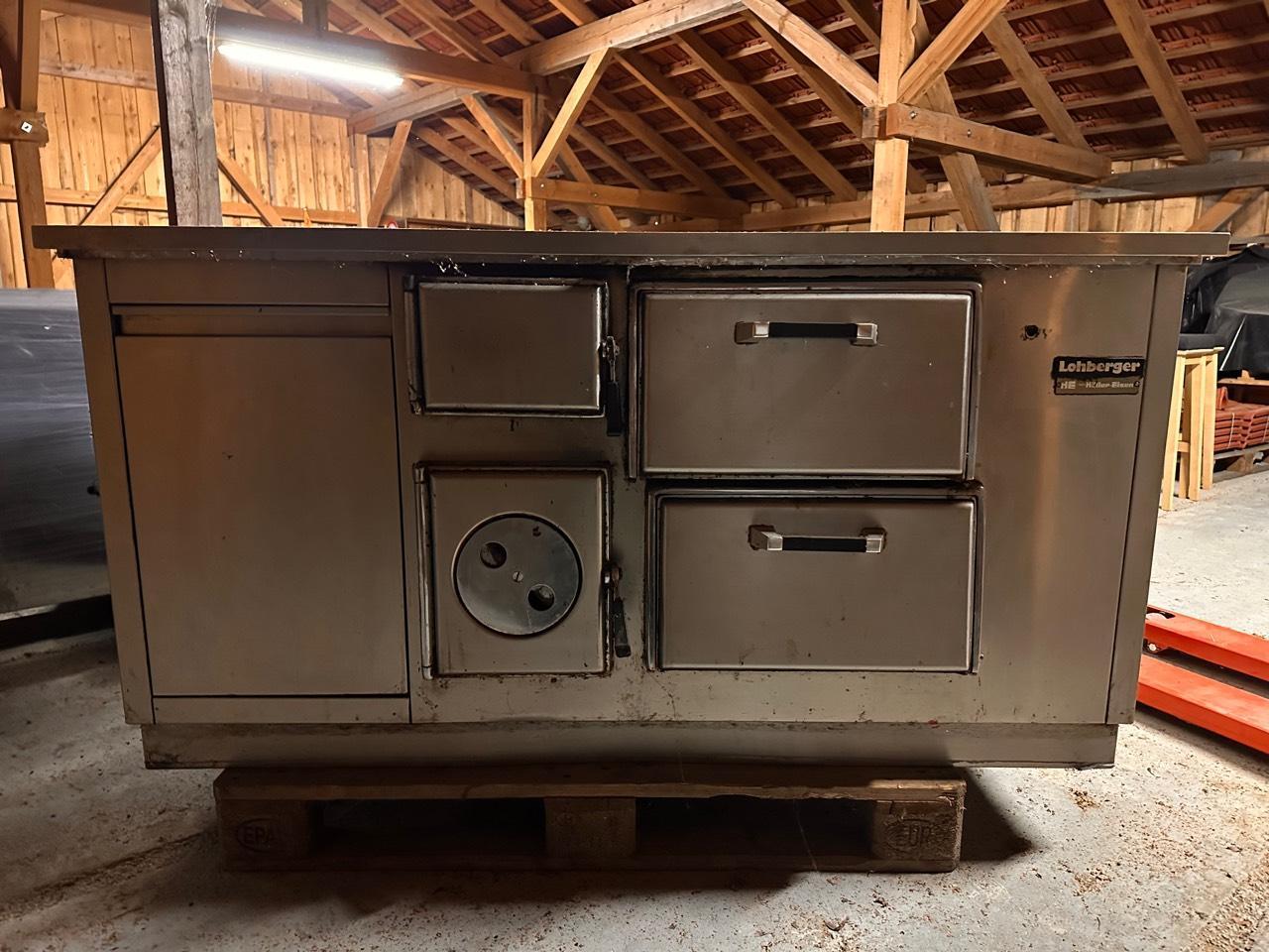 Lohberger Wirtschaftsofen mit Wasseranschluss für Boiler oder Heizung. Zwei Backrohre und Warmhaltefach, ideal für Hütten, Almen.