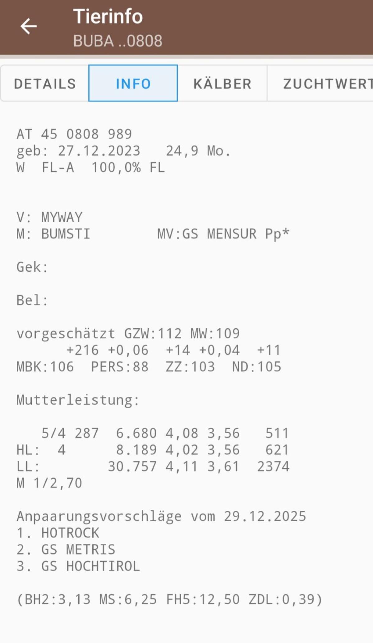 Verkaufe trächtige Zuchtkalbin, geweidet, gealpt, sehr zutraulich, trächtig mit FV. Abkalbetermin 27. Juni 2026. HL 8.189 l.