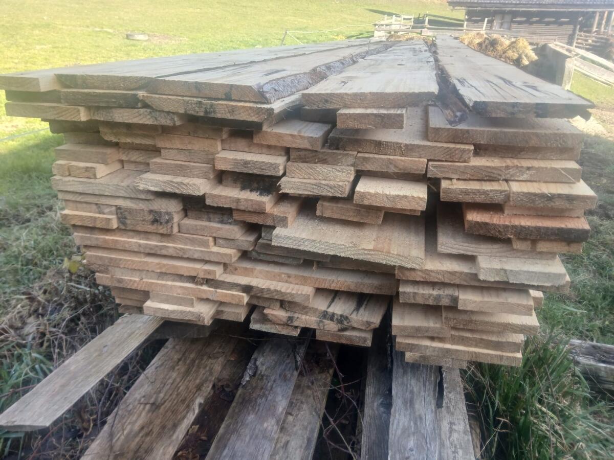 6 Stk., 400 x ca. 45 x 5, 5, 6 Stk., 300 x ca. 40 x 5, 5, ca. 1 m³ Tischlerholz aus einem Baum, 4 m beinahe astrein, 3 m astig, 2 Jahre im Freien gelagert. Drevo Reziv