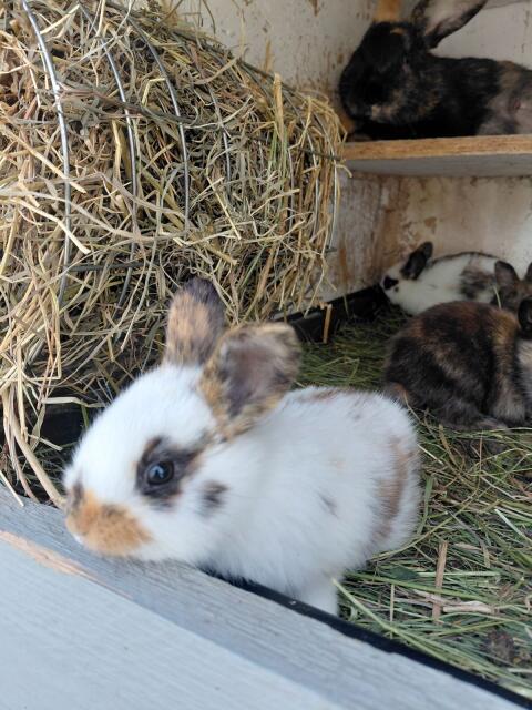 Habe laufend Jungtiere zur Abgabe. Alter bei der Abgabe 8 Wochen. Sind hauptsächlich Mixe aus Rheinischen Schecken und Japanern, also sehr robust. Endgewicht ca. 4 k