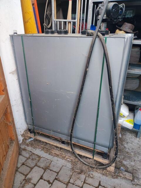 Tankgröße: 1.000 l (gebrauchter IBC-Standard), Inhalt: Diesel, geeignet auch für Heizöl, AdBlue oder Diesel/Biodiesel bis B30, Pumpe & Zapfpistole: el. 230 V-Pumpe (