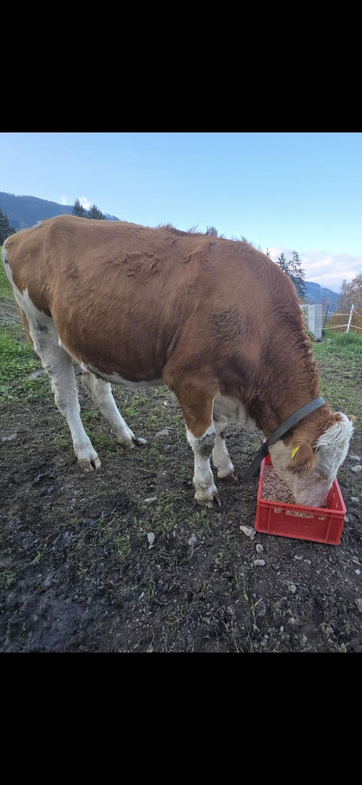 Verkaufe ein trächtiges Bio Fleckvieh/Limousin Rind. Gen. hornlos, belegt mit leichtkalbigen Angus Stier (Iron). Sollkalbedatum 12.02.2026. Trh s hovädzím dobytkom F