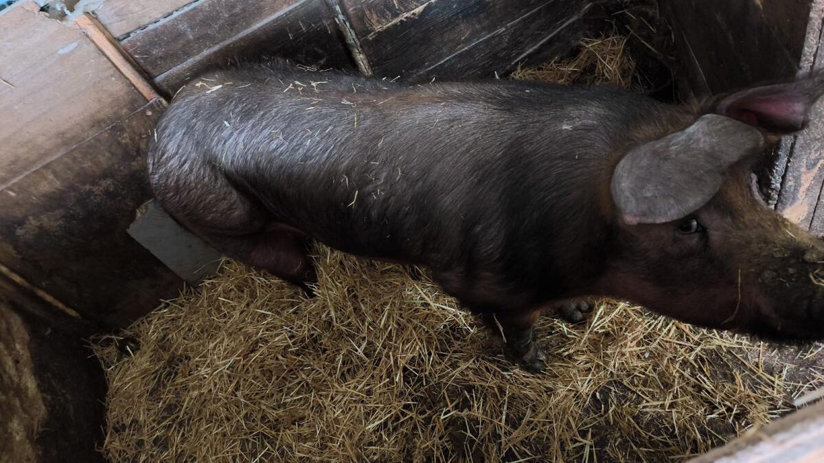 Verkaufe die schwarze Sau ganz links auf dem Bild. Waren den ganzen Sommer draußen. Hat mittlerweile 160 kg. Zum selbst Abstechen oder zur Abholung der Schweinehälft
