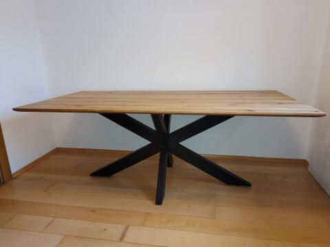 Vergebe einen hochwertigen Esstisch. Ganz neu, frisch aus der Tischlerei, mit Gradleisten und Tischgestell. Eichenplatte auf der Unterseite gefräst, damit sie edler