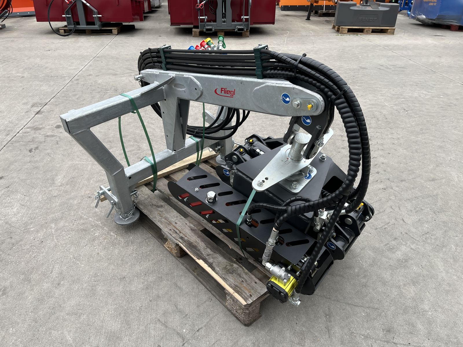 Hier wird eine Neuentwicklung von Fliegl angeboten, die Verladezange VZ 130 Combi Cut mit Harvesteraggregat und Euro und Dreipunktaufnahme. 3DW Steuergeräte und
