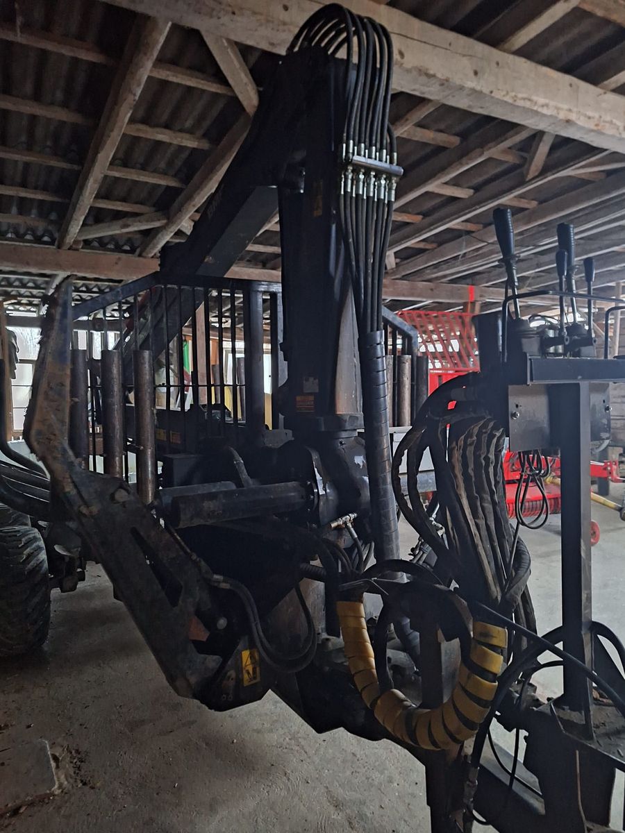 Wenig benutzter Rückewagen mit 8 t Ladekapazität und 6, 5 m Kran. 4 Rungenpaare, 5 Rungenbänke, ausziehbare Rahmenverlängerung. Hydraulische Bremse auf einer Achse mi