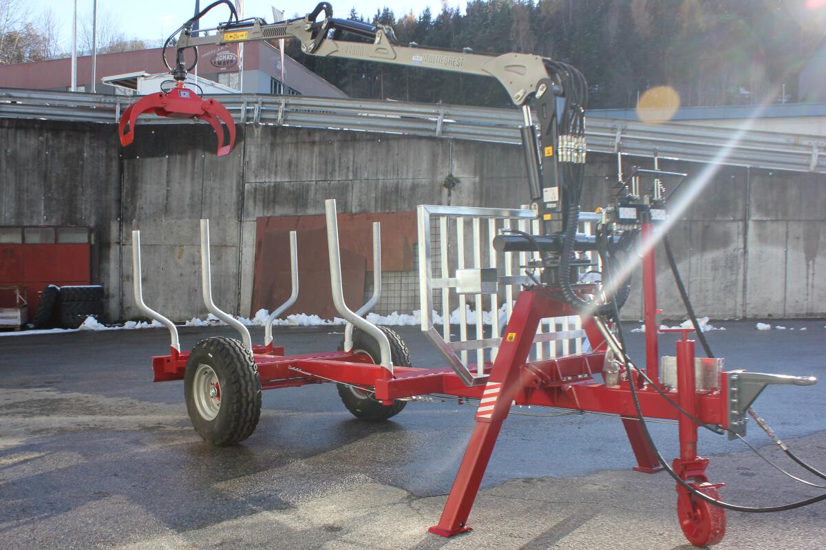 Rückewagen EA50, Forstkran 5, 3 m inkl. Holzgreifer und Rotator, Einachs-Holzanhänger 5 t, hydr. Bremse, 3 Rungenpaare mit 6 Rungen (nicht verstellbar), inkl. starkem