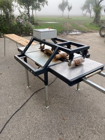 Doppelbesäumer spezial für Bandsägen die Bretter mit großen Wurzelanlauf machen.Durch die mitten geführten Bretter bis 50 mm, können diese bis zu einen Meter breit