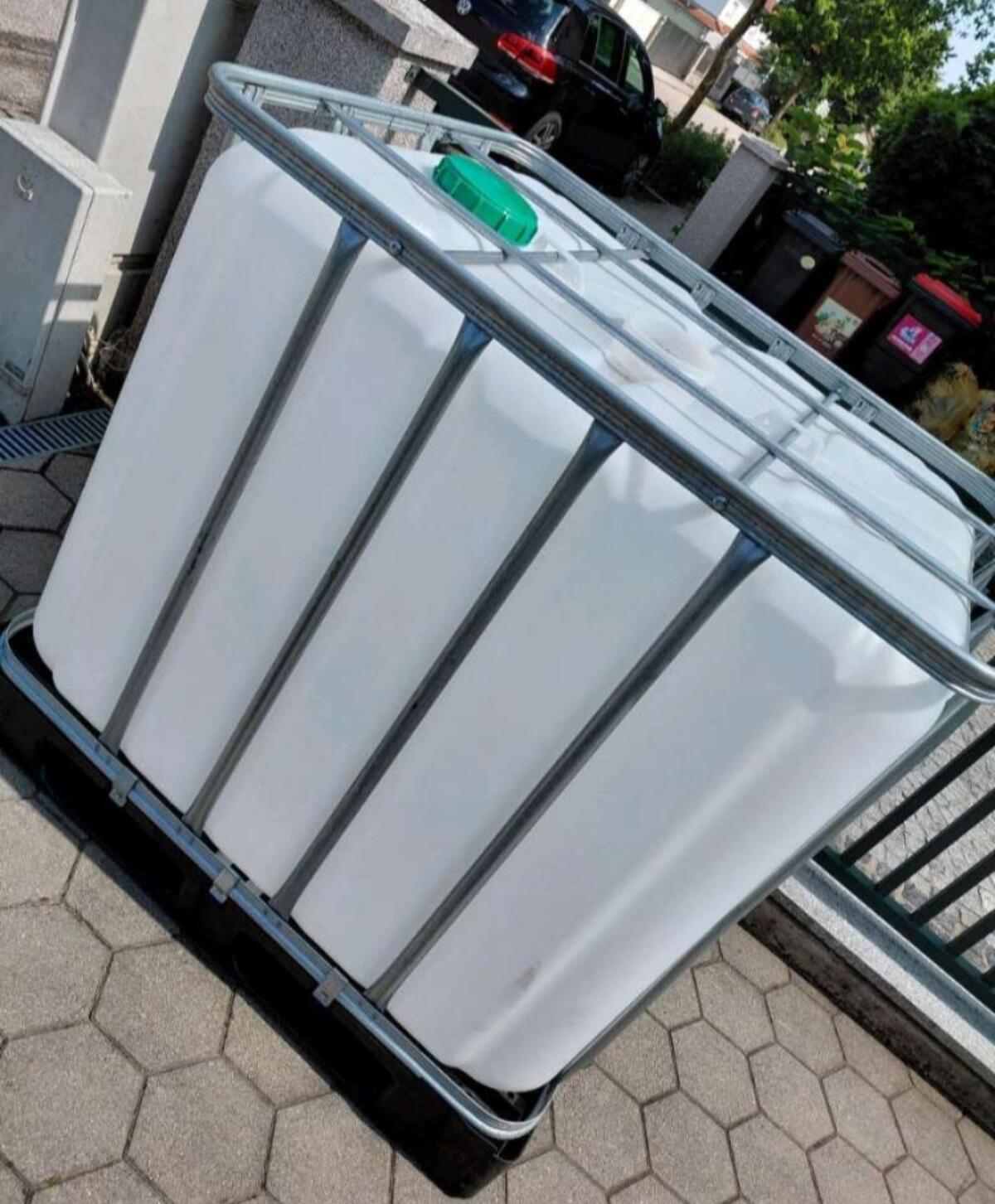 1.000 l IBC Wassertank. Neuwertig. Auf PV-Palette. Inkl. Ablasshahn. Tank war einmalig mit Lebensmittel befüllt. Mehrere Stk. vorhanden. Eventuell auch Zustellung mö