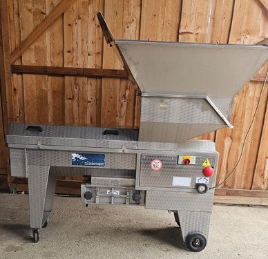 Daten: - gebraucht - Variator - Edelstahlkorb - Abbeerfinger aus Gummi - Quetsche - Übernahmetrichter für Großkisten - Auffangwanne mit Schnecke für Impellerp