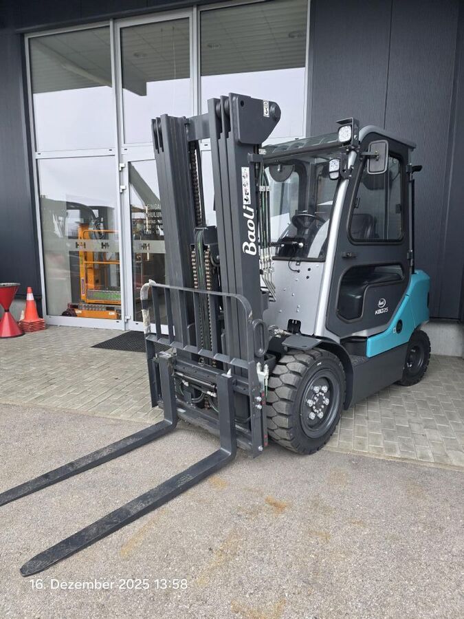 Bauart: Frontstapler / Dieselstapler, Tragkraft: 2500kg, Hubhöhe: 4650mm, Bauhöhe: 2202mm, Freihub: 1453mm, Gabellänge: 1200mm, Bereifung vorne: Superelastik Neu , Bereifung hinten: Superelastik Neu , Anbaugeräte: Seitenschieber, Sonderausstattung: 3. Ventil, 4. Ventil, Beschreibung: Baoli Dieselstapler mit Vollausstattung: Triplex Vollfreihub HH 4650mm, Lastschutzgitter, Vollkabine inkl. Heizung, 3. Ventil mit vorgebauten Seitenschieber, 4. Ventil verschlaucht bis Gabelträger, Arbeitsscheinwerfer, Blue Point Scheinwerfer, Panoramaspiegel, USB Steckdose,
