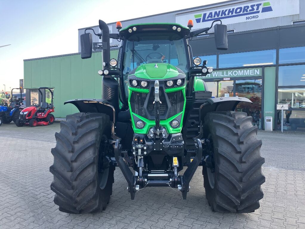 DEUTZ TCD 6.1 L06 4V Stage V Motor. 4 Ventile DCR (Deutz CommonRail). 6 Zylinder. 6057 cm³ Hubraum. SCR System (Selective Catalytic Reduction), EGR (External Gas Recirculation) und passiver DPF (Diesel Partikel Filter). Nenndrehzal 2100 U/min. Leistung bei Nenndrehzahl (ECE R 120): 163 PS/ 120 kW. Max Leistung (ECE R 120): 171 PS/126 kW. Elektronisch geregelter Viscolüfter. Hydrostatische Lenkung mit separater Pumpe. Elektrohydraulische Betätigung für Zapfwellenkupplung. Batterietrennschalter in der Kabine. Handbremse Bedienung mechanisch Zweileitungs Druckluftbremsanlage M.R. Version EU/DE Batterie: 12V-180Ah-800A Begrenzungsleuchten vorne sowie Blinker vorne + hinten Halogen. Bremslicht und Begrenzungsleuchten hinten LED Halogen Scheinwerfer vorne Vorbereitung Arbeitsscheinwerfer auf Kotflügel hinten Arbeitsscheinwerfer vorne in der Motorhaube Standard Batteriestromkreis Bei Joystick für Steuergeräte ohne Umschaltung P1,P2,P3 Vorbereitung für ABS Steckdose, Vorbereitung für i-Monitor Vorbereitung für Bedienung I-Monitor über Touchscreen Auspuff nach oben am A-Pfosten Kraftstofftank: 350 Liter + AdBluetank 29 Liter Tankdeckel ohne Schloss Luftfilter mit Staubejektor Druckluftserviceanschluss mit Spiralschlauch und Druckluftpistole Abgasstufe V Standard Ausführung Remote-Anschlüsse hinten, mit Abreißfunktion und Ölauffangsystem Drucklose Rücklaufleitung hinten Anhängesystem Ausführung Sauermann, Anhängebock lang Hubstreben beidseitig verstellbar Heckkraftheber mit elektronischer Regelung EHR Unterlenker mit Schnellkupplern Fanghaken Mechanischer Oberlenker (CBM) Externe Bedienung für Heckkraftheber und Zapfwelle am linken und rechten Heckkotflügel Kotflügel hinten mit Fernbedienung Heckscheibe unten fixiert, Heckscheibe ausstellbar Kennzeichenhalter vorne auf Auspufftopf Karosseriefarbe DEUTZ-FAHR grün Rückenverlängerung für Fahrersitz Klimaanlage manuell Armaturenbrett "InfoCenterPro" mit 5" TFT Farbdisplay (km/h) Kabine Maxi Vision RCshift mit Satelitarmlehne und MaxCom Joystick, mit Comfortip. Vorbereitung für Radio mit Antenne und 4 Lautsprecher, Kühlfach für Getränke und Ablagefächer, seitlich und hinten getönte Scheiben Scheibenwischer/ -waschanlage hinten Automatik-Sicherheitsgurt für Fahrersitz Multifunktionsarmlehne rechts Beifahrersitz gepolstert mit Sicherheitsgurt Spezifikation für deutschsprachige Märkte Elektrische Anlagen Standard Maschine Bedienungs- und Wartungsanleitung (Deutsch) Homologation für EEC Markt (Mother Regulation) Zeichen Geschwindigkeit Heckscheibe Schilder "Warnhinweise" Zusätzlicher Werkzeugkasten auf der linken Seite Hinterachse mit Flanschverbindung Powershuttle mit SENSE CLUTCH Getriebe RCshift 54+27 vollautomatisch 5 Gänge 6 Lastschaltstufen + Kriechganggruppe Felgen vorne und hinten voll verschweißt Kotflügel Verbreiterung Außenbreite 2400 mm OPTIONEN: -Hydraulischer Oberlenker mit Fanghaken automatisch -Oberlenker Kat. III für FKH mit automatischem Fanghaken -Elektr. Steuergerät für Frontkraftheber -Frontkraftheber mit doppeltwirkenden Zylindern (Hubkraft 4110 kg), ohne Dreieck. -Power Beyond Kupplung (bei LS-System) -4 hintere Steuerventile mit Durchflussregler. Elektronische Bedienung auf der Satellitenarmlehne für 1. + 2. Steuergerät mit Zeitsteuerung. Mechanische Bedienhebel für 3. + 4. Steuergerät (2x Schwimmstellung, gesamt 8 Anschlüsse). -Komfortpaket für Frontkraftheber: Fernbetätigung FKH, 7-polige Steckdose, 1 Steuergerät elektr. mit 2 doppelt wirkenden Anschlüsse vorn. -Load-Sensing Verstellpumpe mit 120 l/min Förderleistung -Kabine MaxiVision+ mit Armlehne und Seitenkonsole für Steuergeräte Kombination mechanisch und elektrisch -Heizung für Kraftstofffilter -Fangschalenhalter Kat.II-III/II -Autom. Anhängekupplung D 38 mm, und Kugel Anhängekupplung K80 höhenverstellbar -Sitz Max-Dynamic DDS XL Dynamische Niederfrequenzfederung, breites Sitzpolster längs und in der Neigung verstellbar, drehbar 10° (links) bis 20° (rechts) -DAB+ High Level Radio mit Freisprechfunktion. Voll integrierte Antenne im Kabinenhimmel. FM/DAB Tuner; Bluetooth, USB und Klinkeneingang. Integration der letzten Anrufe in das InfoCenterPro. -XLarge Vision: ausziehbare XL-Rückspiegel mit LED-Beleuchtung. -4 hintere und 4 vordere LED-Arbeitsscheinwerfer im Kabinendach + Ambientebeleuchtung in der Kabine -Kotflügel vorne verstellbar und schwenkbar mit Fußstütze -Bereifung Marke BKT 38"-42"-46" -Bereifung: 540/65R28 vorne, 650/65R38 hinten -Endgeschwindigkeit 50 Km/h Super ECO -Kabine, pneumatisch gefedert, niveaureguliert bei Druckluftanlage -Frontscheibe geschlossen, Seitenscheiben links und rechts ausstellbar -AGROSKY Performance Steering ready mit "EASY STEER" Funktion zur Einstellung der Lenkübersetzung -Schiene auf der Oberseite der Kabine (zwischen rechter A- und B-Säule) zur Befestigung von Fremdgeräten -Schmutzabweisende Bodenmatte für Kabine -Dachluke Glas mit UV-Beschichtung -Einstellbare automatische Seitenstabilisierung Unterlenker links und rechts -Hubzylinder D.100 mm, 9700 kg -Fronttriebachse gefedert mit Lamellensperrdifferenzial 100% und ASM/SBA -2 Rundumleuchten H1 -2 Arbeitsscheinwerfer LED IV hinten unten -7 polige Signaldose ISO 11786 für Anbaugeräte (z.B. für Feldspritze) -2 Arbeitsscheinwerfer auf Blinkposition IV Generation LED -Wiederholscheinwerfer über Blink- und Positionsleuchten -Vorbereitung ISOBUS Gerätesteuerung nach ISO 11783 (Steckdose Heck, Steckdose für Terminal in der Kabine) -Bedienpanel für Arbeitsscheinwerfer (WOLP) Preisanpassungen, Zwischenverkauf und Irrtümer vorbehalten Standorte können abweichen Intern: S49275