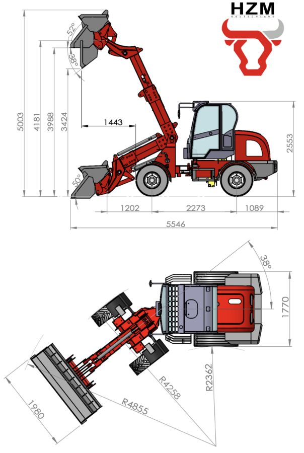 Ihr starker Partner für anspruchsvolle Einsätze Der HZM Teleskopradlader 816-T Profi kombiniert kraftvolle Leistung, Vielseitigkeit und Qualität in einer robusten Maschine, ideal für den Einsatz auf dem Bau, in der Landwirtschaft, im Garten- und Landschaftsbau sowie im gewerblichen Bereich. Als leistungsstarker Teleskopradlader überzeugt der 816-T Profi mit noch mehr Leistungsreserven, durchdachter Konstruktion und hochwertiger Verarbeitung für maximale Zuverlässigkeit im täglichen Einsatz. Top-Ausstattung für maximale Effizienz Der HZM 816-T Profi ist mit einer 0,8m³ Standardschaufel ausgestattet. Das hydraulische Schnellwechselsystem mit Euro-Aufnahme ermöglicht einen werkzeuglosen Wechsel von Anbaugeräten wie 4-in-1-Schaufeln, Kehrmaschinen oder Palettengabeln. Dank des dritten Hydraulikölkreises können auch Geräte mit Zusatzfunktionen problemlos betrieben werden, für maximale Flexibilität. Weitere Anbaugeräte sind auf Anfrage erhältlich. Leistungsstarker Antrieb, präzise Steuerung Ein robuster Yunnei-Dieselmotor mit 61 PS mit einem Bosch Common-Rail-System sowie Bosch Elektronik, sorgt für souveräne Kraftentfaltung bei gleichzeitig niedrigem Verbrauch. Das leistungsfähige Wandlergetriebe ermöglicht sanfte, kraftvolle Bewegungen, während die elektrisch gesteuerte Wendeschaltung am Joystick eine einfache, intuitive Bedienung garantiert – für effizientes Arbeiten in jeder Situation. Funktionalität und Komfort, durchdacht bis ins Detail Mit einer Kipplast von 2.700 kg und einer Hubhöhe von 3.988 mm (Unterkante Schaufel) ist der HZM 816-T Profi bestens gerüstet für schwere Hebe- und Transportaufgaben. Eine vollständige Beleuchtungsanlage sowie zusätzliche Arbeitsscheinwerfer sorgen für optimale Sicht, auch bei schlechten Lichtverhältnissen und erhöhen die Sicherheit auf jedem Einsatzort. Die komfortable Kabine ist vollausgestattet mit gefedertem Sitz, Heizung und Lüftung für angenehmes Arbeiten auch bei längeren Einsätzen. Qualität, die sich auszahlt HZM steht für langlebige Technik, geprüfte Sicherheit und praxiserprobte Konstruktion. Der Teleskopradlader 816-T Profi erfüllt alle geltenden CE-Normen und Richtlinien und ist speziell für den intensiven, täglichen Einsatz ausgelegt. Die robuste Bauweise und hochwertige Verarbeitung gewährleisten höchste Zuverlässigkeit, auch unter härtesten Bedingungen. Selbstverständlich verfügt der 816-T Profi über die notwendigen COC-Dokumente und kann somit straßenzugelassen werden. Warum Profi? Die neueste Generation des HZM 816-T Profi ist mit einem weiterentwickelten Joystick ausgestattet, der in Kombination mit dem neuen elektronisch angesteuerten Hydrauliksteuerblock eine nochmals präzisere und feinfühligere Steuerung ermöglicht.Der 3. und 4. Steuerkreis lassen sich komfortabel direkt über den Joystick anwählen, ebenso die Dauerdruckfunktion sowie die Schwimmstellung, was maximale Effizienz und Kontrolle bei anspruchsvollen Arbeiten garantiert.Abgerundet wird das Profi-Paket durch leistungsstarke LED-Arbeits- und Fahrscheinwerfer, die selbst bei Dunkelheit für optimale Sicht sorgen und die Nacht sprichwörtlich zum Tag machen.