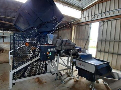 Kistenkippgerät für Kistenbreite von 1,4 Meter bis 2,4 Meter Details: - zwei doppelwirkende Zylinder - Kippwinkel: 180° - Füllstandssensor - Funkfernbedienung - Warntonsignal Optional: - hydraulische Abdeckung Optional für Geräte mit hydraulischer Abdeckung: (1,4 m Kippgerät) - automatische Dosiersteuerung - Querband mit Frequenzumrichter - Längsband mit Frequenzumrichter