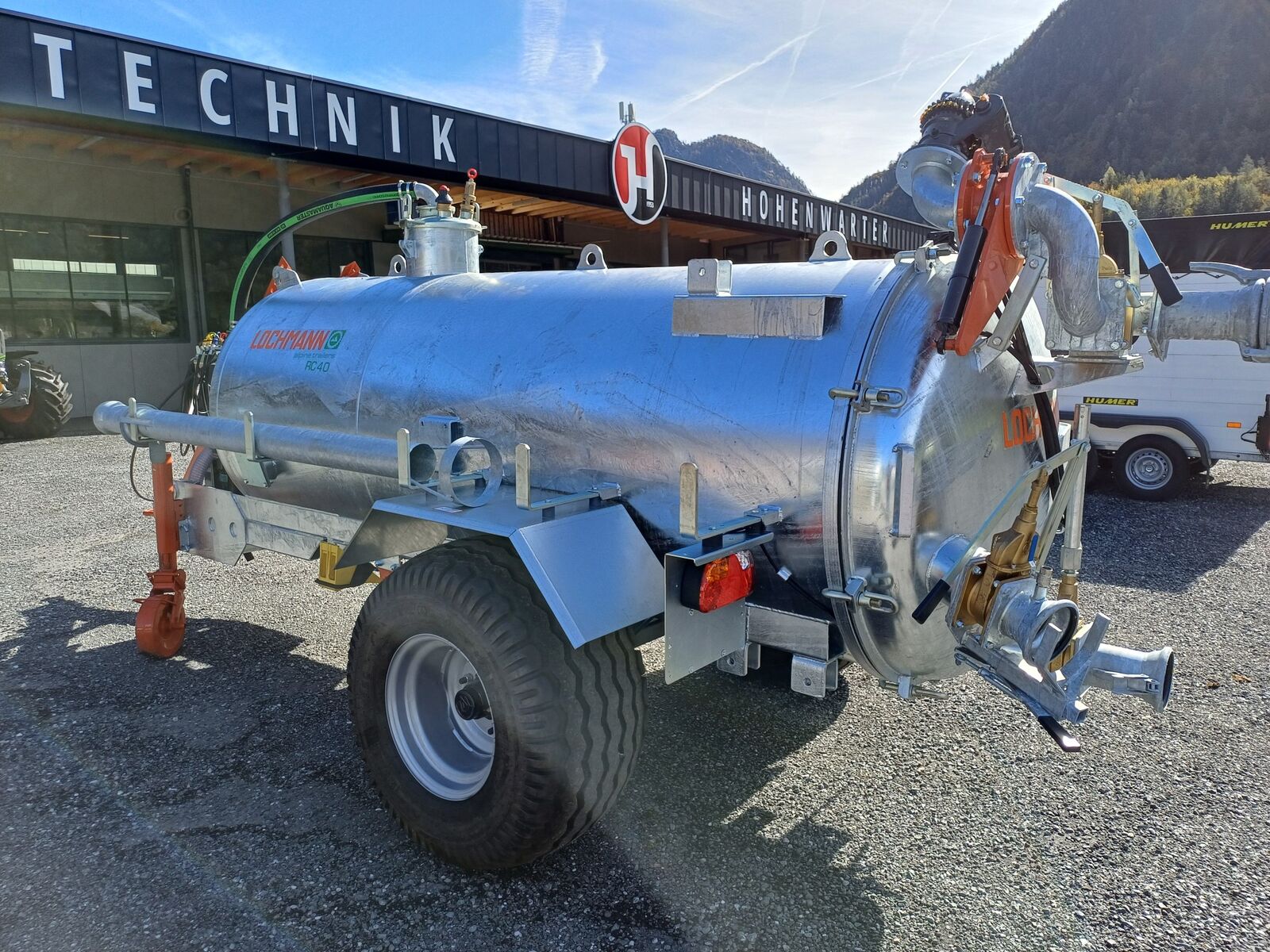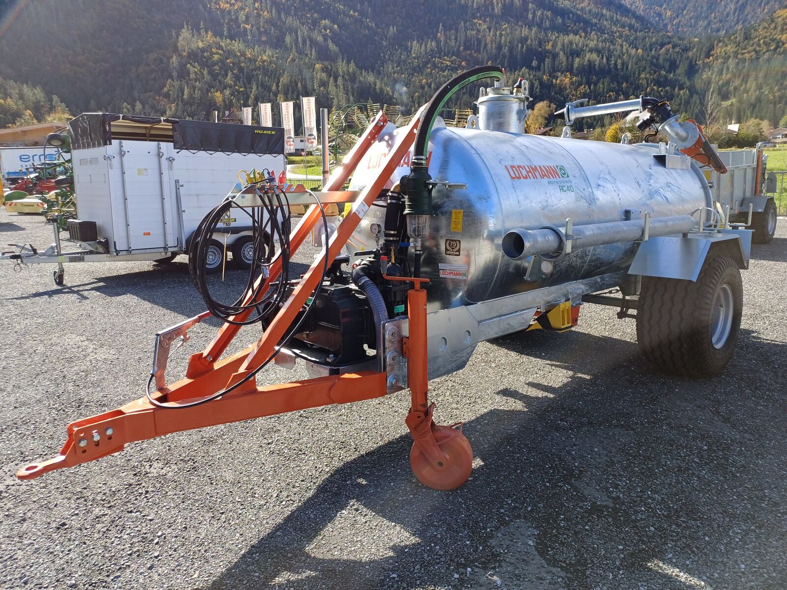 Technische Daten des LOCHMANN RC 40 Garda > Einachs-Gülletankwagen mit Vollachse und Trommelbremsen > Ungefedert in Niedrigbauweise für tiefen Schwerpunkt und hohe Stabilität > Stahltank, ca. 4000 Liter, vollständig feuerverzinkt > Fassboden zum Öffnen und Dom oben > Kombipumpe Battioni Pagani Garda mit Vakuumpumpe MEC 5000 (ca. 5000 l/min bis 3 bar) und Kreiselpumpe (ca. 6.500 l/min bis 8 bar) > Automatik-Zwangsschmierung der Vakuumpumpe, Zentralbetriebe mit Ölbadschmierung, manuell umschaltbar > Füllstandsanzeiger an der Vorderseite des Tanks > Überlaufschutz durch Schwimmerventil und Sifonventil mit Sichtglas > Über- und Unterdruck-Sicherheitsventile > Manometer zur Druckanzeige > Hydraulische Schieber 5" vorne und hinten, mechanische Schieber 4" und 5" hinten > Blindflansche vorne rechts und links > 5 m Saugleitung mit Schnellkuppler (2 m Saugschlauch und 3 m verzinktes Stahlrohr) > Hydraulisch drehbare und schwenkbare Güllekanone mit Endlosrotor > Universal-Breitverteiler > Deichsel für Oben- und Untenanhängung > Bereifung 500/50x17 > Mechanische Standbremse, hydraulische Betriebsbremse (Einleiter) > Lichtanlage mit 3 Funktionen > Stützrad > Halterungen für Schleppschlauchmontage > Gelenkwelle optional erhältlich > Gewicht 1700 kg