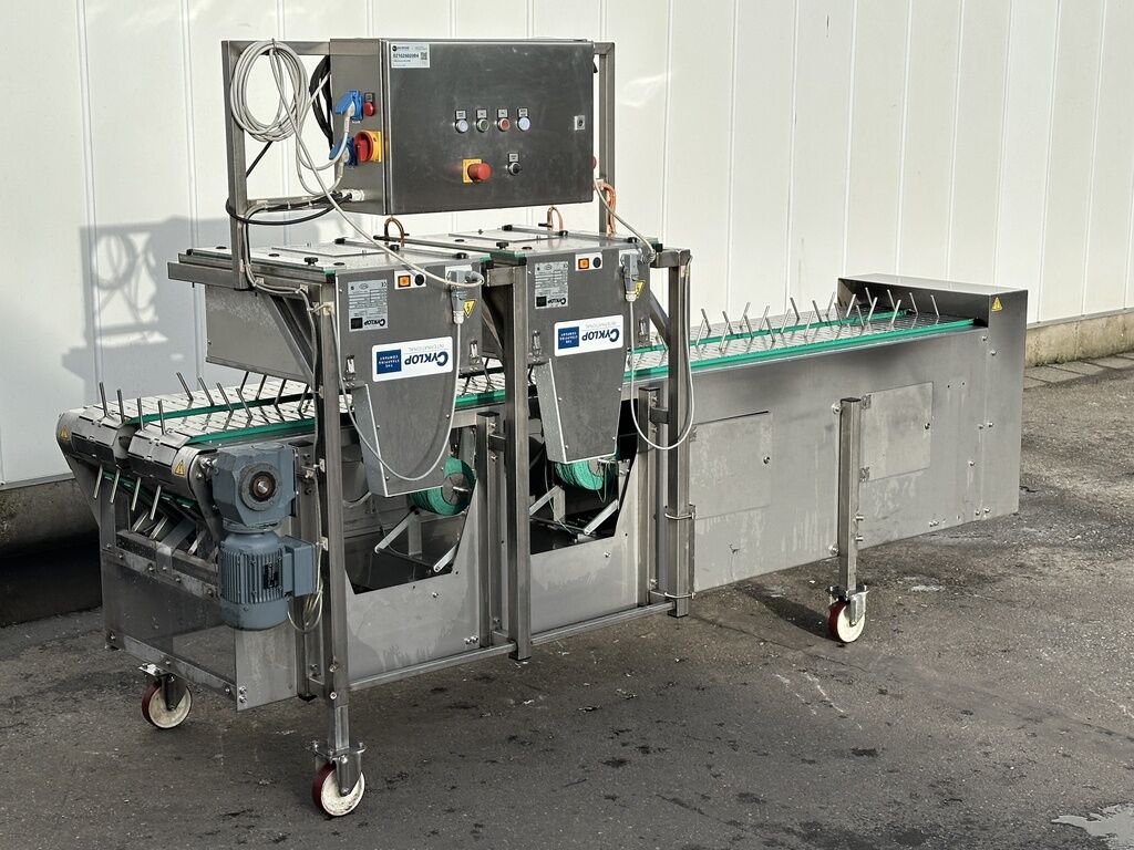 Dieses System wurde speziell für das Bündeln von automatisch geernteten Bundmöhren mit Grün entwickelt.Aufgrund der großen Menge an Schmutz ist die Bindemaschine über dem Produkt installiert. Diese Maschine kann auch zum Bündeln von Lauch, Rhabarber, Spargel, Kräutern und anderen Produkten verwendet werden.Die Funktionsweise der Maschine: Die Bündel oder verschiedenen Gemüse werden zwischen Tragegabeln gelegt. Diese Aufnahmegabeln sind auf zwei Förderketten montiert. Das Produkt wird zur Bindemaschine transportiert und automatisch gebündelt.Gesamtlänge der Maschine 3 Meter Freq. geregelt Mit 2 Axro-FQC2-L-MD35-RVS-TS-PLC-SK Edelstahlbindern, kopfüber installiert und bindend, speziell für nasses Produkt Produktträger auf einer EdelstahlketteArbeitshöhe 700-900 mm Elektrischer Anschluss 230 Volt Aufnahmeleistung 2 Kw36 kg Elastik grün 2KWeitere Informationen oder eine vollständige Angebot? Fragen Sie das einfach und schnell an auf unsere Duijndam Machines Website! Sie können uns auch anrufen.Alle zuverlässigen Maschinen finden Sie auf unserer Website.Seit 40 Jahren zuverlässiger Händler von gebrauchten Landwirtschafts- und GartenbaumaschinenDie Maschinen werden vor Auslieferung geprüftErfahrenes TeamWir können Ihnen helfen, die Maschine zu Ihrem Unternehmen zu TransportierenDuijndam MachinesDer Spezialist in Gebrauchtmaschinen für Landwirtschaft und Gartenbau