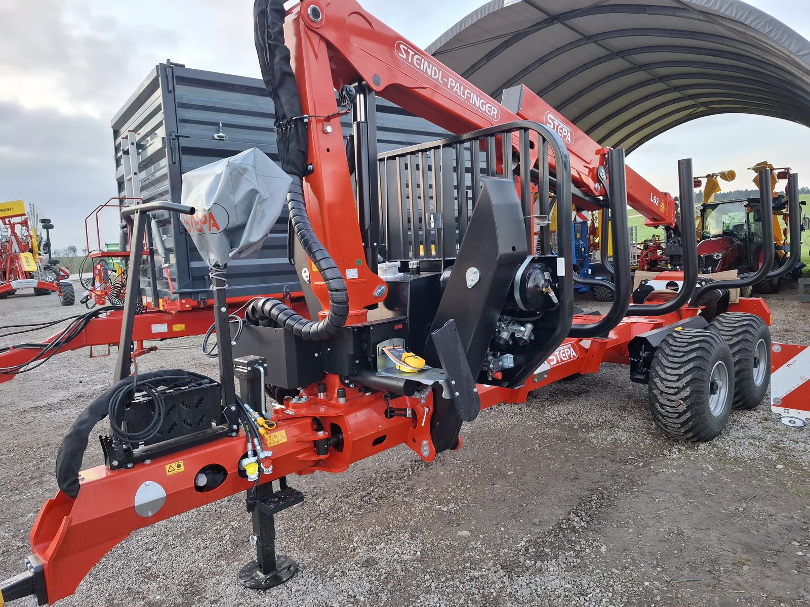 STEPA Forstanhänger C12 + Hexagonal Rahmen mit 12t zul. Gesamtgewicht (15t auf nicht öffentlichen Straßen bei 10km/h) + Rahmen mechanisch ausziehbar und Knickdeichsel inkl. 2 Steckkupplungen für Traktorhydraulik + Pendel-Tandemachse inkl. Feststellbremse + Druckluftbremsanlage auf allen 4 Rädern + Rungenhalter für 10 Rungen inkl. 4 Rungenpaare + LED - Beleuchtunglt. StVO im Rahmen geschützt + Frontgitter und Kurbelstützfuß + Zugöse mit patentierter Deichsel, Untenanhängung + Bereifung 400/60 - 15,5 - 6-loch Felge + Forstfelge mit beidseitiger Hornverstärkung und Ventilschutz schraubbar und Reifen mit Schläuche + Inkl österr. Typisierung, für 25km/h + Hydrauliktank im Frontgitter integriert zur Eigenölversorgung + Gelenkwelle mit 1-seitigem Weitwinkel STEPA Forstkran FL 6295 * Rotator 4,5t mit Flansch und Epslink Kreuzgelenk * Flap-Down Abstützung * 2-Kreis-Hydraulik mit CAN-BUS Joysticksteuerung mit 2 x 4-fach Steuerblöcke elektrisch proportional gesteuert inkl. Hochstand, Abdeckplane und Hochdruckfilter (Funksteuerung einfach nachrüstbar) * Betriebsstundenzähler * 2-Kreisgußpumpe 2x38l/min bei 600 U/min * Knickzylinderschutz * Hubzylinderschutz * Ölkühler 12V kompl. mit Thermostat * Scheinwerferbausatz mit 2 LED-Scheinwerfer ca. 1000 Lumen kompl. mit Ein-Aus-Schalter, 1xScheinwerfer am Knickarm und 1x an Kransäule * Forst-Paket: Motorsägen-, Kanister- und Sappelhalterung * Forstgreifer mit 160cm Öffnungsweite kompl. mit Schläuche - 130kg LAGERMASCHINE - Prompt Verfügbar