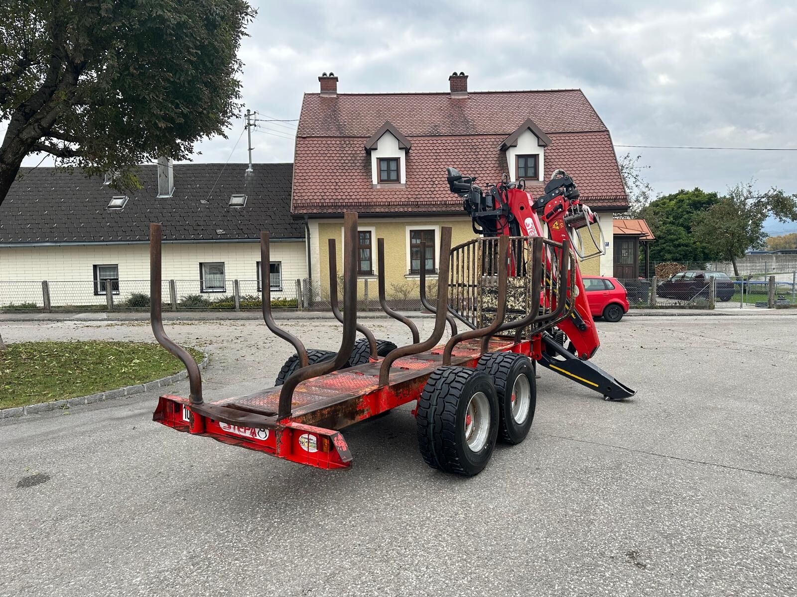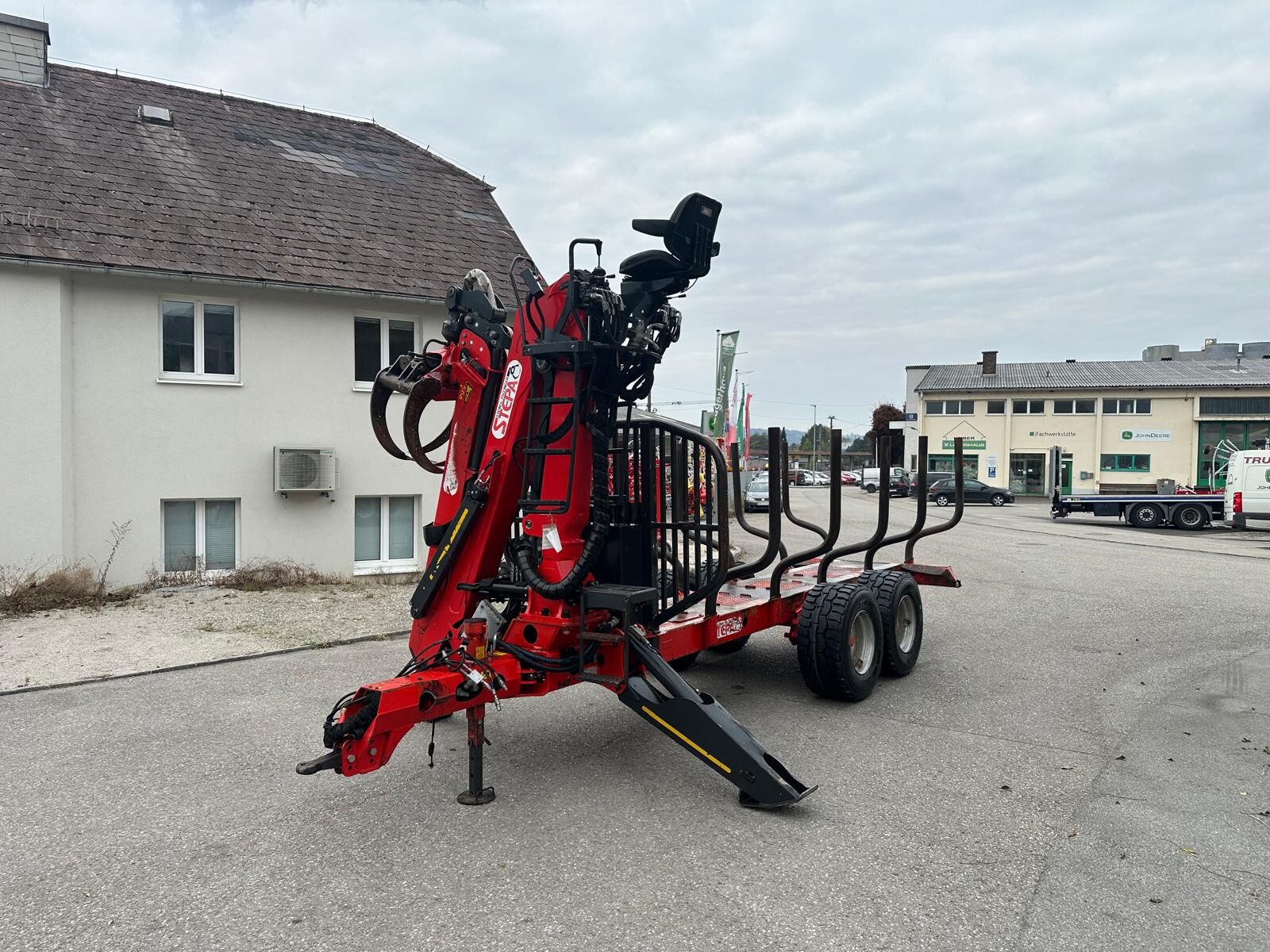Klassifizierung: Gebrauchtmaschine; zul. Gesamtgewicht (kg): 11000; Achsenzahl: 2; Kran: Ja; Kranreichweite: 840; Anzahl Teleskop: 2; Anzahl der Rungen: 5; Anhängeart: Anhängevorrichtung; Typ der Anhängerbremse: Hydraulisch; Eigenölversorgung: Ja; Bedienersitz: Ja; Joystick: Ja; Arbeitsscheinwerfer: Ja; schwenkbare Deichsel: Ja; Beleuchtung: Ja; Greiferart: Holzzange; Pratzenabstützung: Ja; Weitere Maschinenmerkmale: +Z-Kran +Reichweite 8,4 m +hyd. Bremse