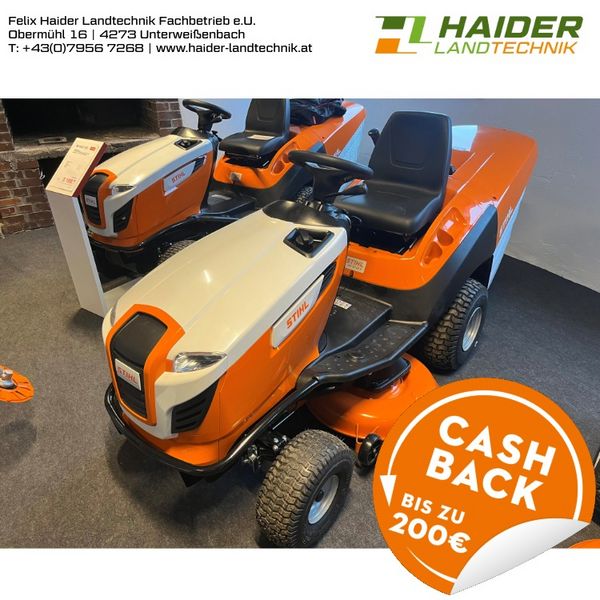 Wir feiern 100 Jahre Stihl! Jetzt zusätzlich 200 € Cashback sichern von 01.03.2026-30.04.2026 16,6PS 2 Zylinder Motor 110cm Schnittbreite Grasfangkorb 350l 1 Pedal Fahrantrieb Elektromagnetische Messerkupplung gefederter und verstellbarer Sitz robuster Rahmen zentrale Schnitthöhenverstellung MADE IN AUSTRIA Zustellung nach Absprache möglich! Nur solange der Vorrat reicht - Nähere Infos gerne telefonisch