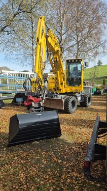 Details: Planierschild; Kabine; Klimaanlage; Heizung; Zwillingsbereifung; Hydr. Schnellwechsler; Hydraulikleitungen; Hammer-u.Greiferleitungen; Geteilter Ausleger; Starrer Böschungslöffel; Tieflöffel ca. 30 cm; Tieflöffel ca. 60 cm; *POWERTILT*; SW Martin