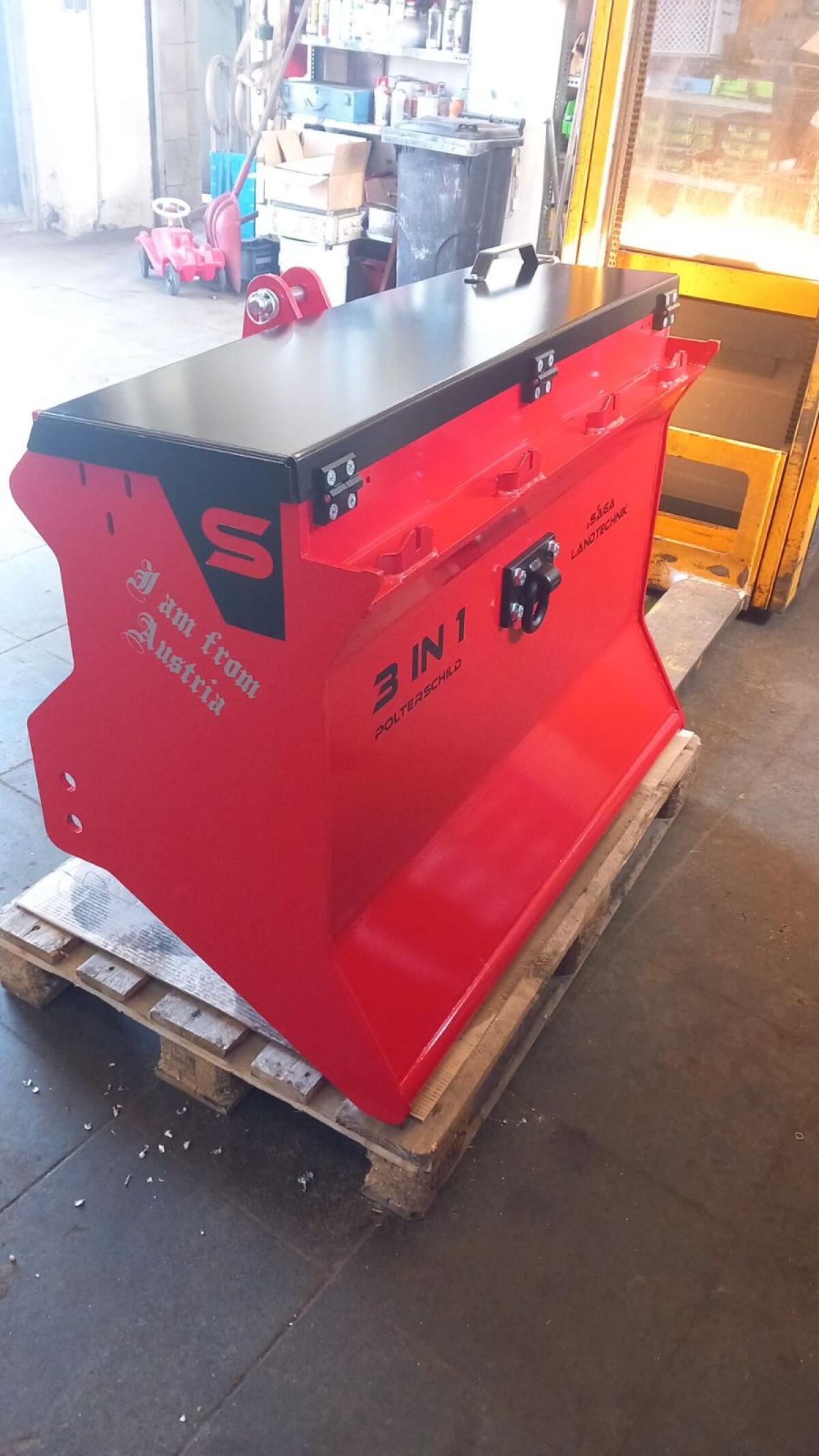 Forstpolterschild mit integrierter Werkzeugkiste, 1, 2 m Breite, 1 m Höhe und ein 30 cm breites Staufach. Optional mit Schubladeneinsatz, Seilwinde, Verbreiterungen u