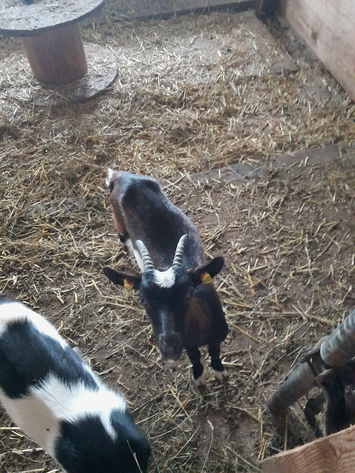 Ziegen: 1 Ziegenbock (7 Monate, sehr verschmust), 1 Ziegendame (6 Monate). Alle Tiere sind handzahm, zusammen gewöhnt und kennen Hunde und Kinder. Nur in gute Hände