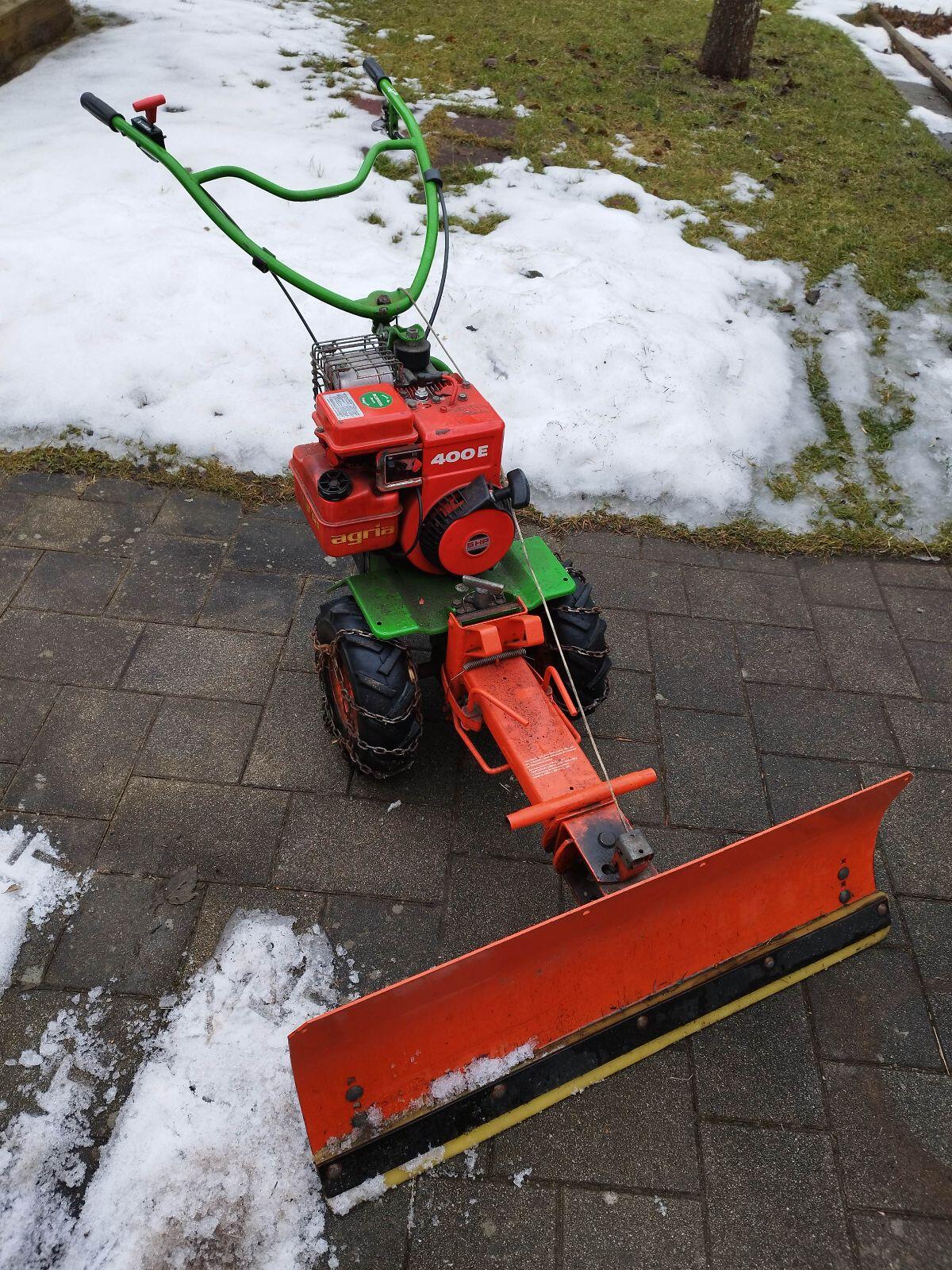 Agria 400E Kombigerät mit Schneeschild und Schneeketten, Motor läuft nicht, Gerät steht schon länger herum. Bei Fragen oder weiteren Fotos, einfach melden.