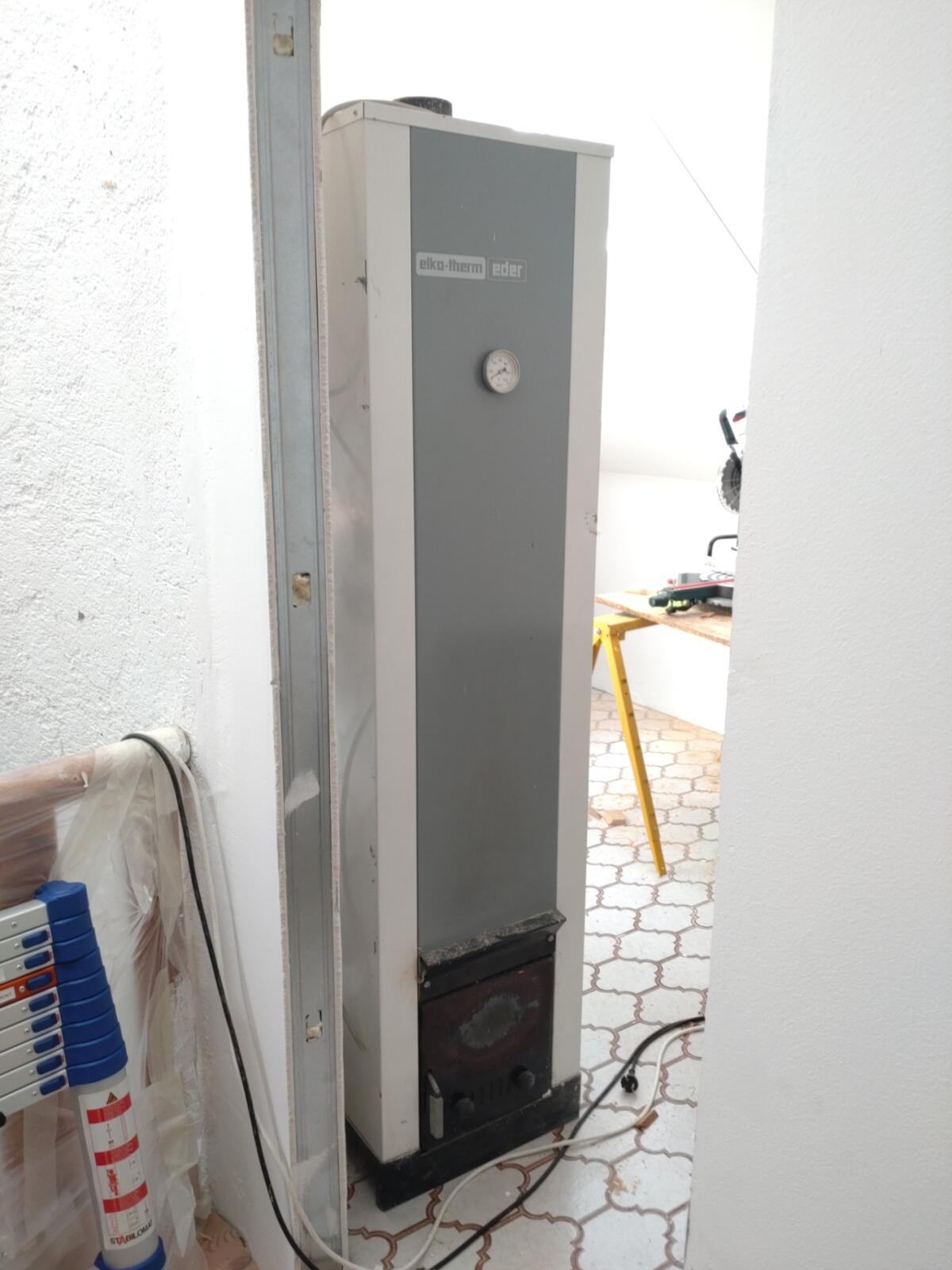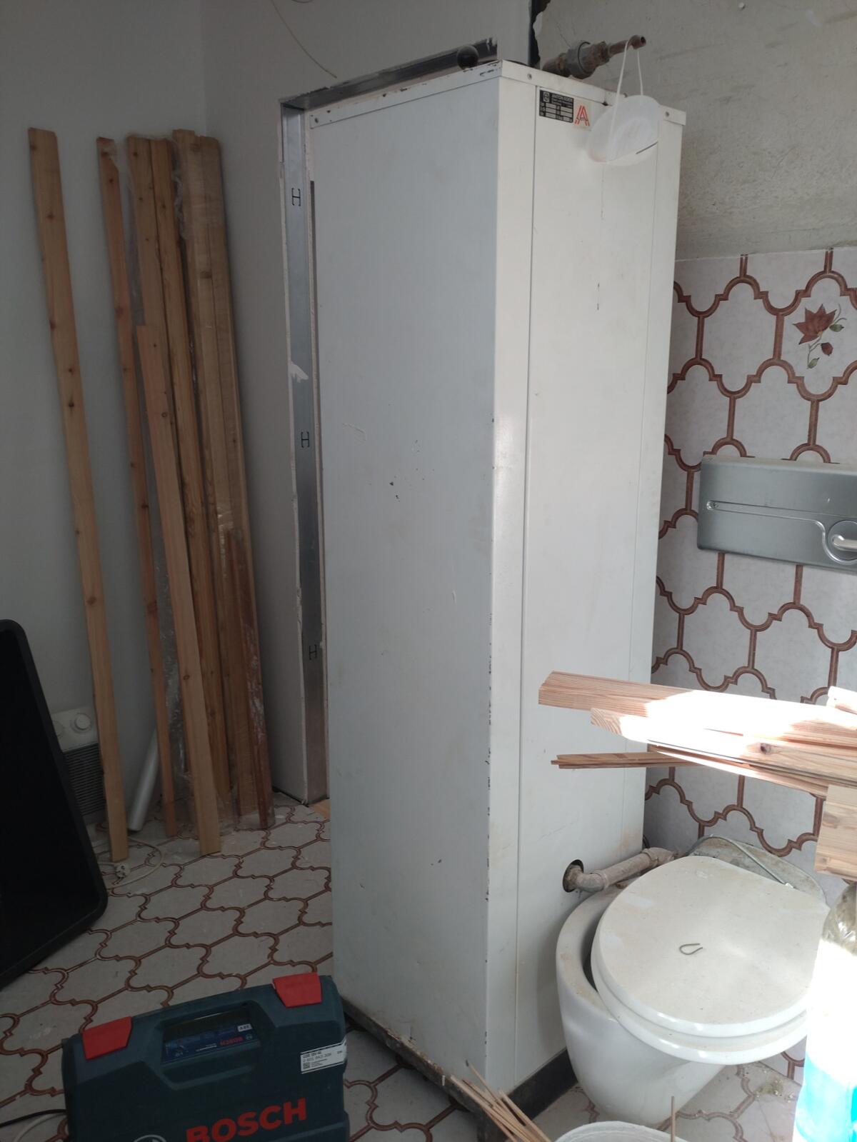 Eder Badezimmer-Warmwasser-Ofen, 0,45x0,45x1,83 m, el. oder mit Holz beheizbar.
