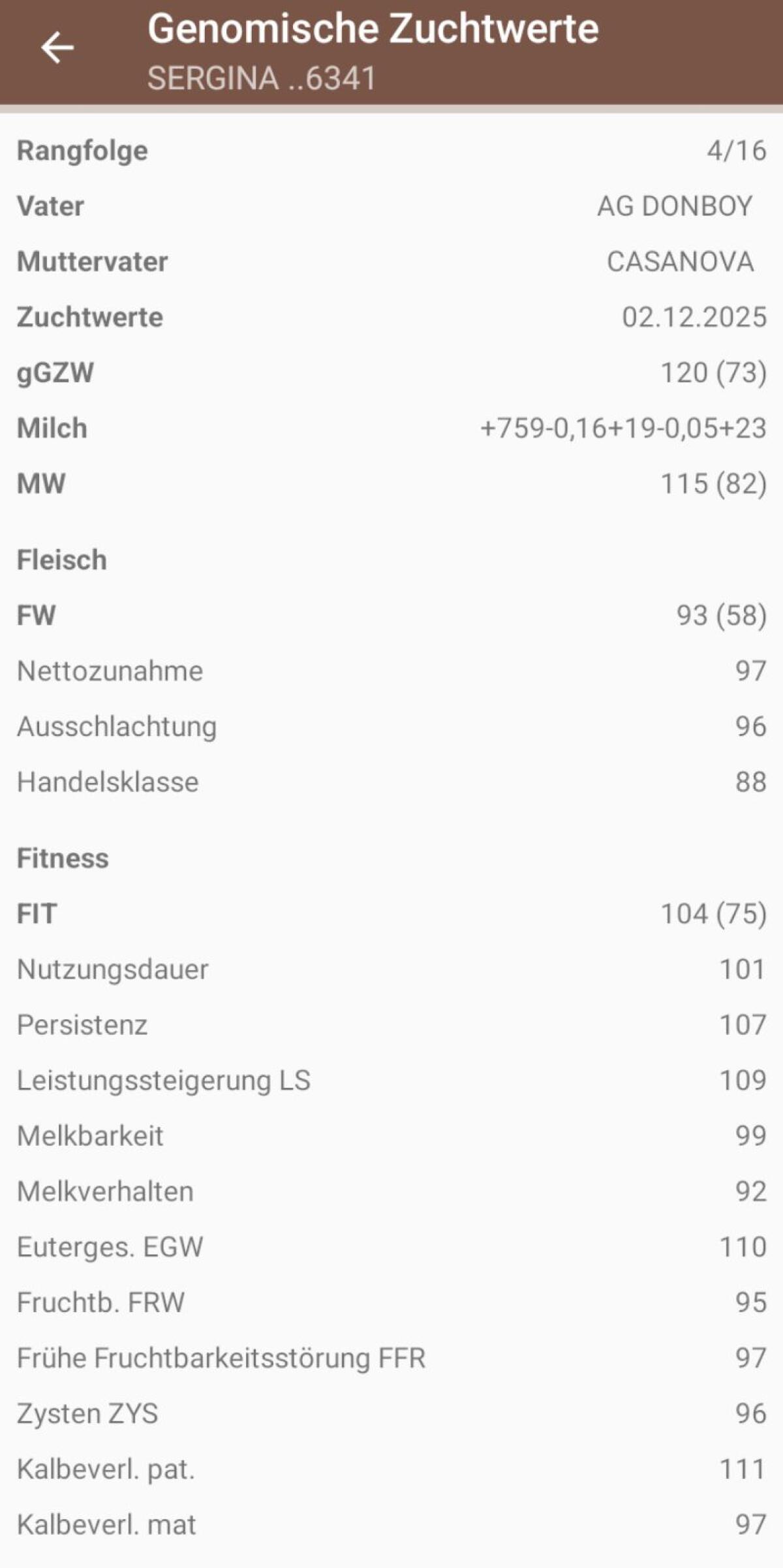 Prodajam veliko 100 % rudo kravo pasme Brown Swiss, ker je prevelika za naš hlev in ne moremo izkoristiti njenega genetskega potenciala. Kupili smo jo kot telico, jo vzgojili in zdaj smo jo pustili teliti. gZW 120/115 +759/-0,16/-0,05. V: AG Donboy (krava je trenutno št. 4 od 16 tipiziranih hčera). Rojena: 22.2.23, telila: 12.12.25. Mati-HL: 2. Lakt 7.244/4,17 % F/3,39 % E. (v ekološkem kmetovanju) Brez dednih napak. Paša in zdaj privezana.