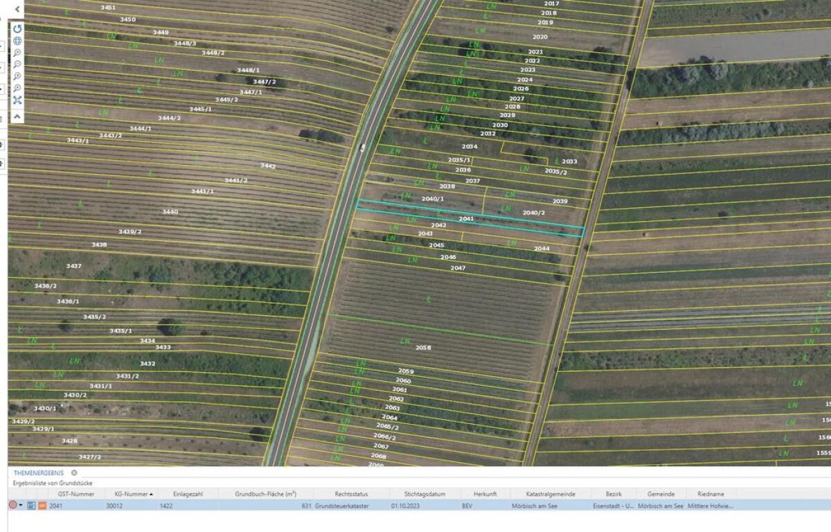 Weingarten ca. 600 m², flach, Zugang zu Wasser (wasserführender Entwässerungsgraben), sehr gute Erreichbarkeit, mit Sämling 88, 2 Reihen à ca. 100 m in Mörbisch am See. Der Bestand ist älter, ca. 20 Jahre und stark ausgedünnt.