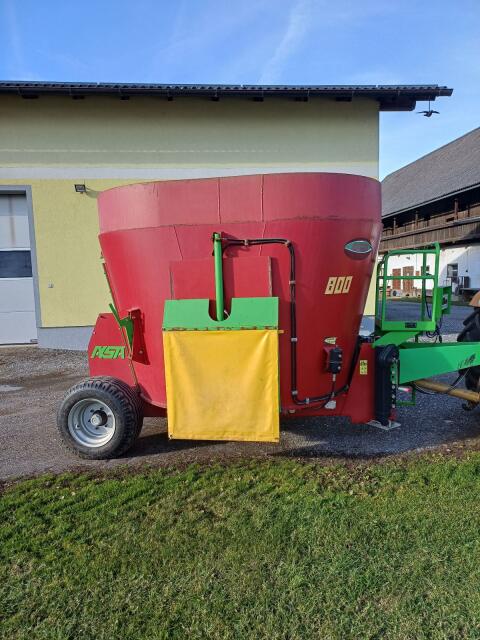 Vertimix 900 (Baugröße wie 1.251), Bj. 2002, 9 m³ Behälter, Förderband 2,27 m, hydr. Stützfuß, hydr. Bremse, Schaltgetriebe, Waage, Bereifung 250/15, Maschinenhöhe 2,55 m, Gelenkwelle. Triebling und Tellerrad vor 2 Jahren getauscht.