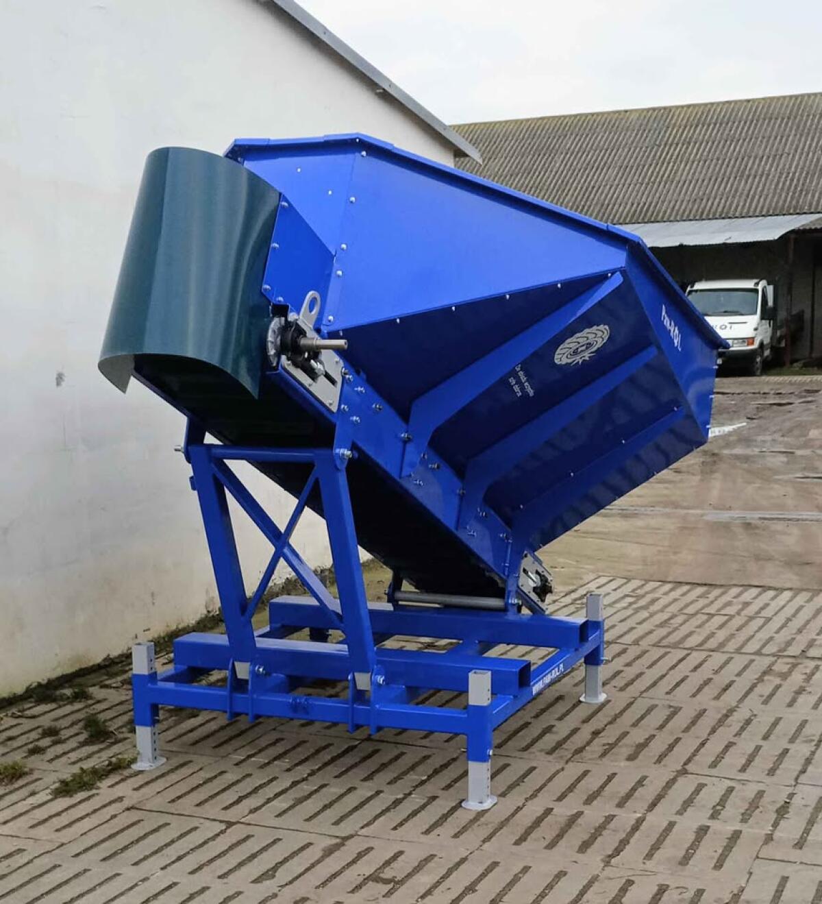Na prodaj je sprejemni zabojnik, lijak za nakladanje krompirja, čebule in druge zelenjave. Konstrukcija je zasnovana za nakladanje z viličarjem neposredno iz paletnih zabojev ali s pomočjo naprave za prevračanje. Kapaciteta: približno 1 t. Izvoz mogoč, proizvajalec iz Poljske. Cena neto. EU – 0 % DDV, zunaj EU +23 % DDV.