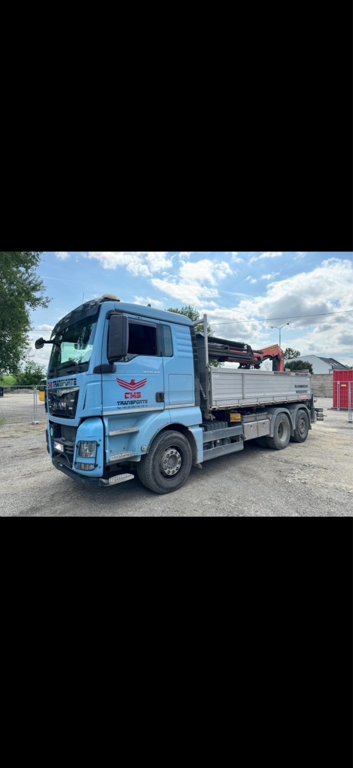 MAN TGX 26.400, 3-Achser, Bj. 07/2015, Heckkran Palfinger PK22002EH, 5 hydr. Ausschübe, Funkfernbedienung, Feitzinger Alu-Kipper mit pendelbaren Bordwänden, Rückfahrkamera, Schlafkabine, lenkbare und liftbare Nachlaufachse, AHK, Standheizung, Hochstand usw. Preis: exkl. MwSt., Vhb.