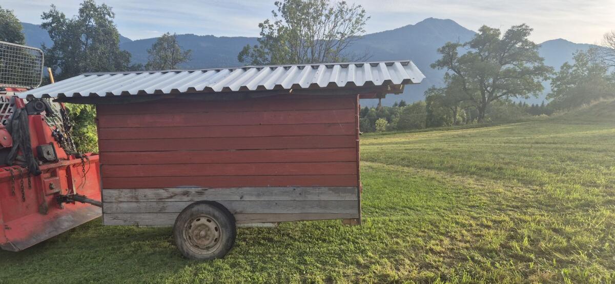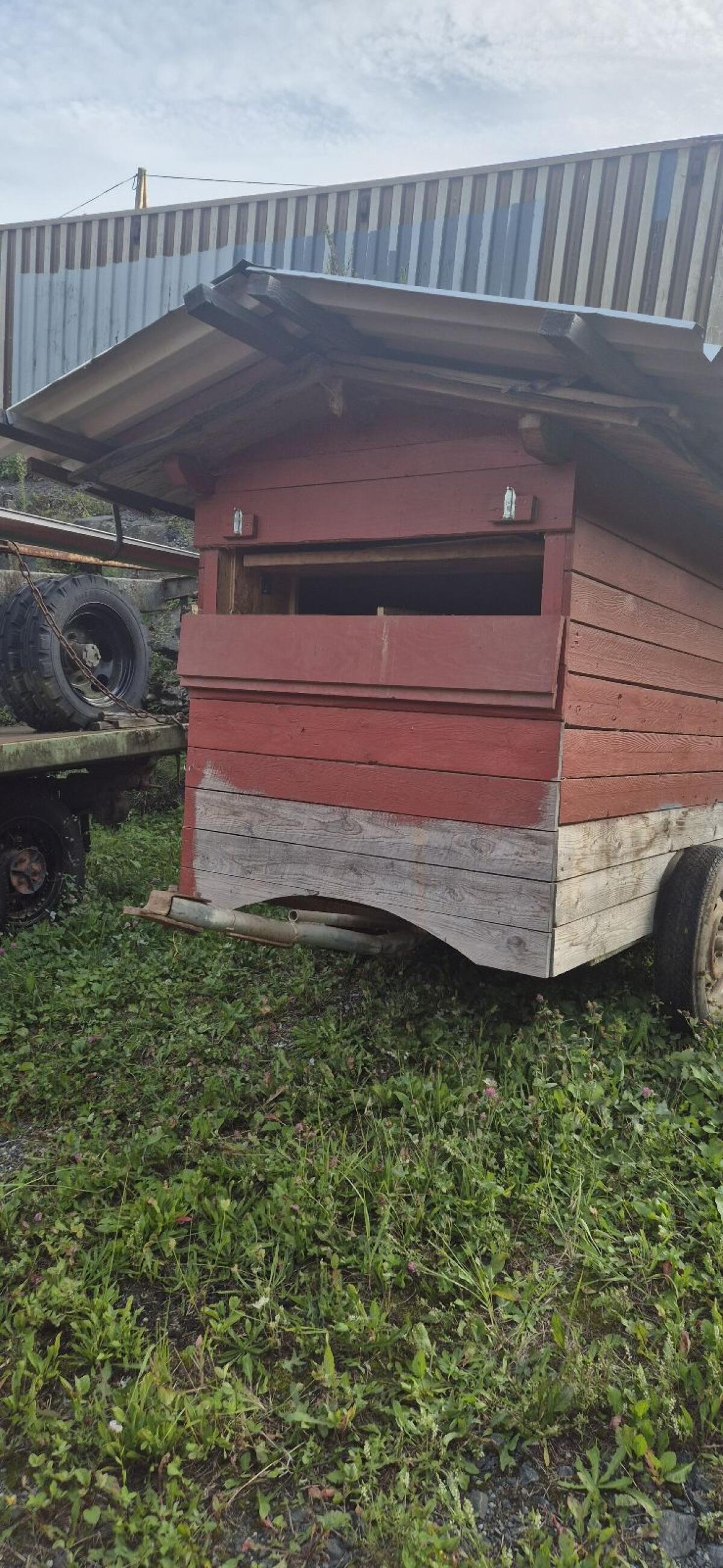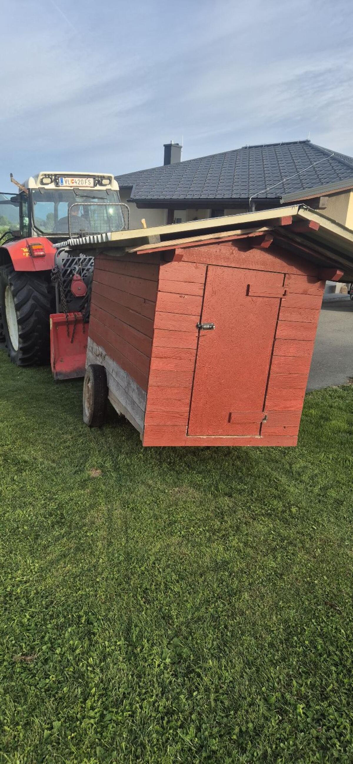 Isolierter mobiler Hühnerstall, zirka 2,30 x 1,50 m. Mit einer Klappe (von außen zu öffnen) bei den Legenestern zum einfachen Abklauben der Eier. Inkl. 2 Leitern, Blechdach, ausgeschnittene Vorbereitung für automatische Hühnerklappe. Inkl. 2 neuer Reifen, einer bereits montiert.
