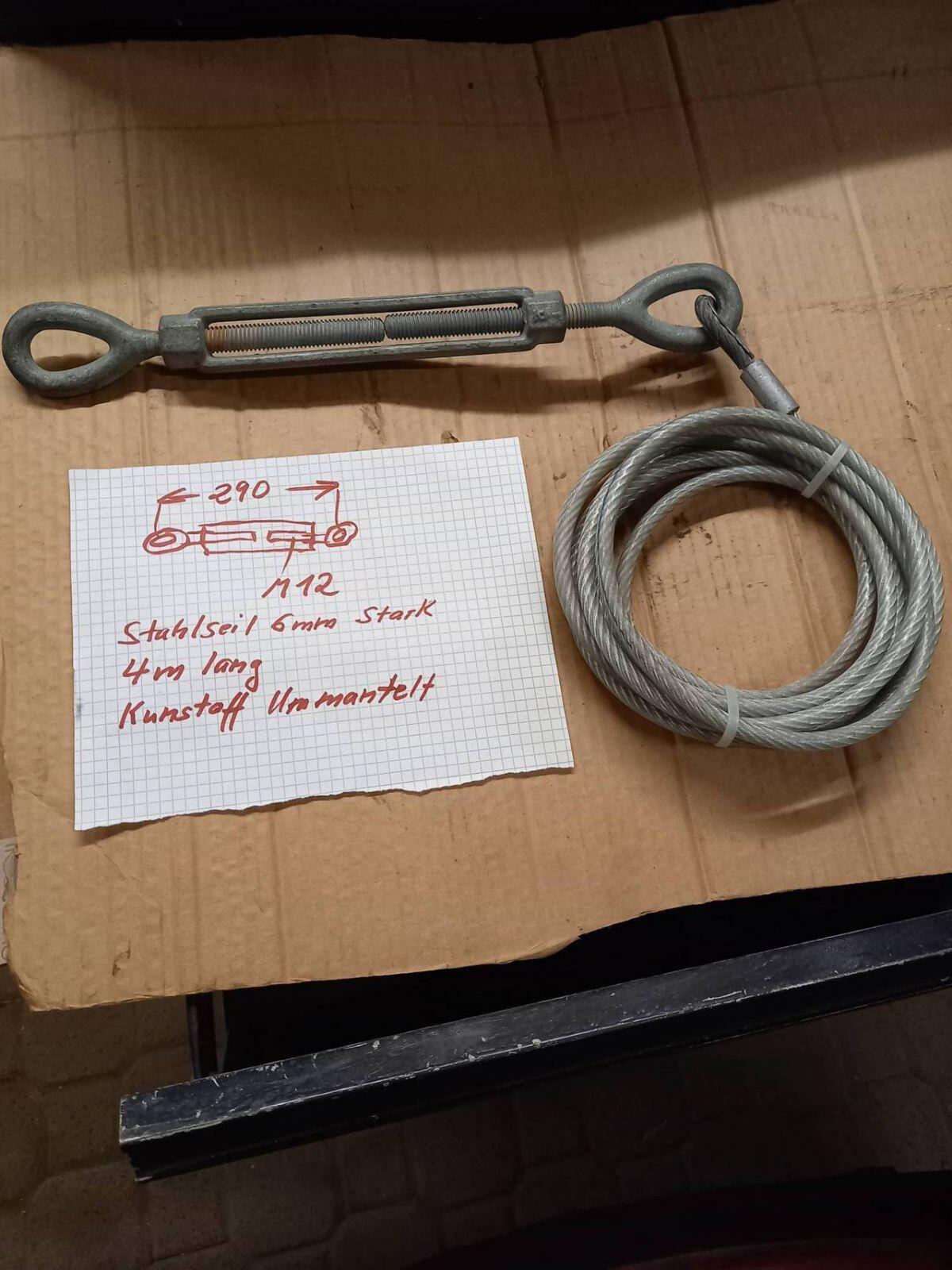 Spannschloss M12 mit 4 m Seil, Dm. 6 mm, Kunststoff ummantelt, inkl. Versand für € 15,-, inkl. Versand nach Österreich € 23,-.