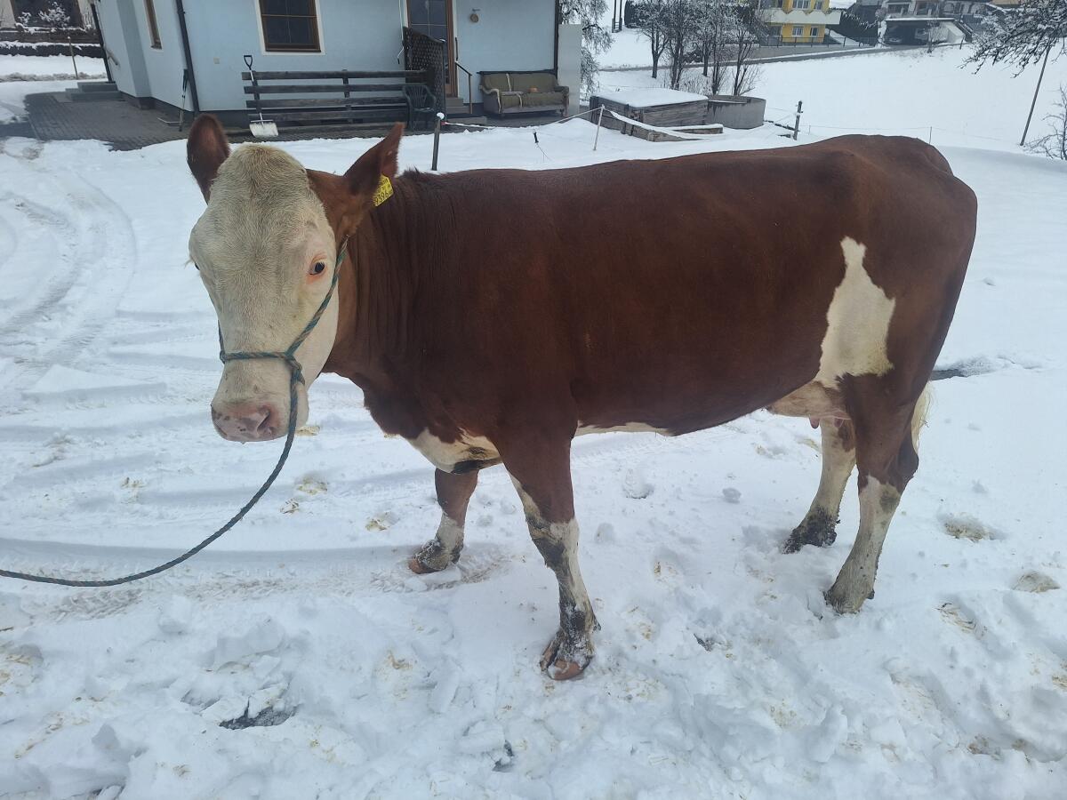 Verkaufe brave Erstlingskuh, Vater Mystic, geboren am 11.10.23, gekalbt am 26.01.26, Milchmenge 35 l, Melkbarkeit 2,6 l/min, konventionell.
