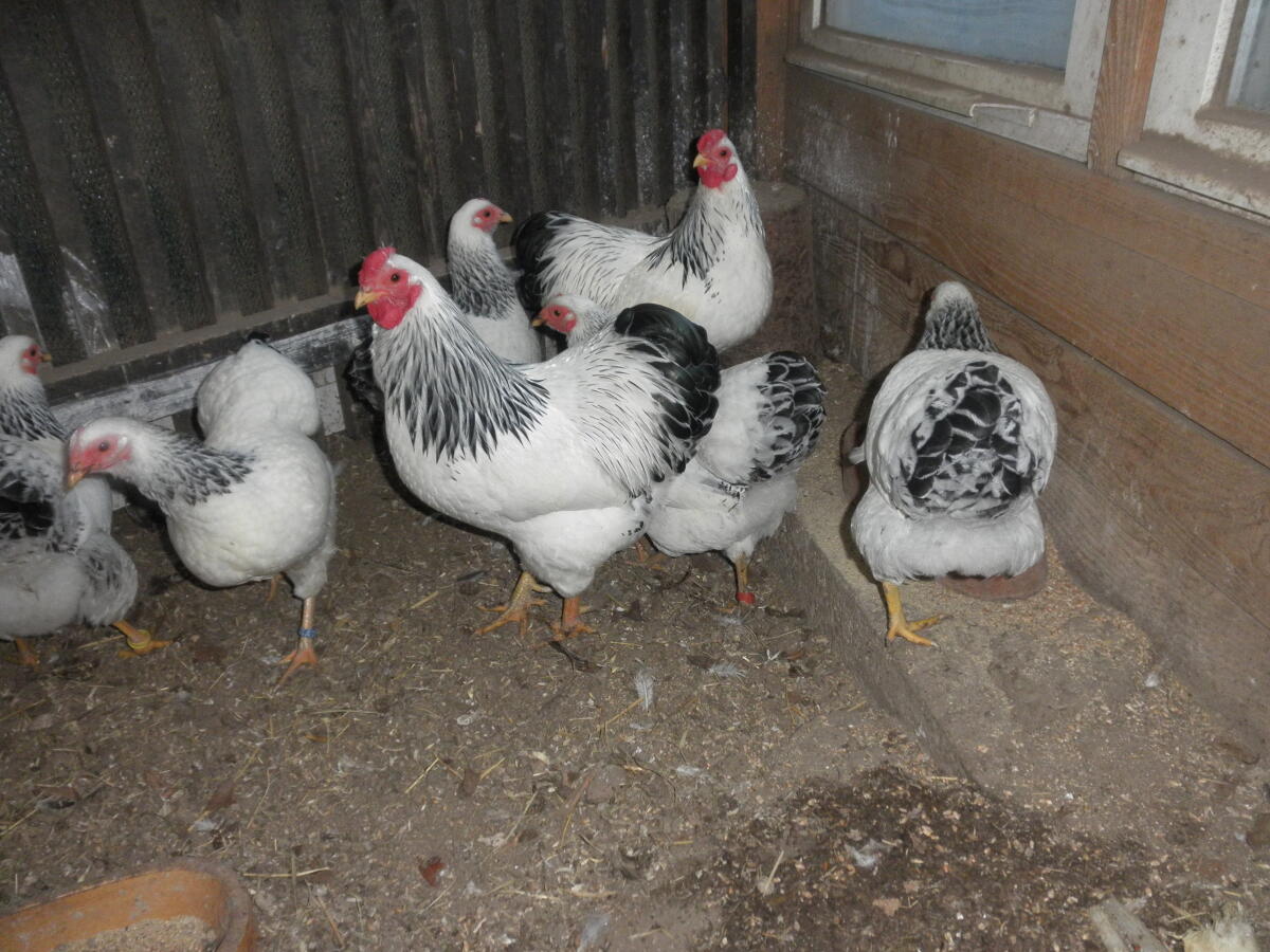 Verkaufe Zuchtstamm 1 Stk. Hahn und 3 Stk. Hennen von Zwerg-Wyandotten, weiß/schwarz/columbia. Gesamt € 100,-.