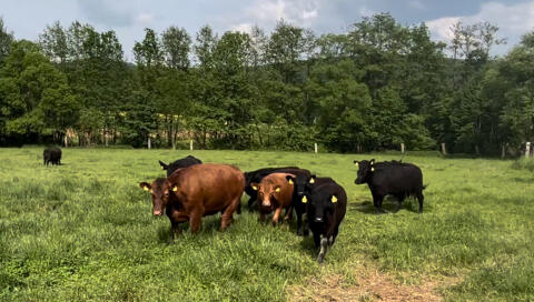 Čista škotska visokogorska krava, stara štiri leta, s septembrskim teletom za prodajo. Teliček je od rdečega angusa. Krava je najverjetneje ponovno breja od angusa.