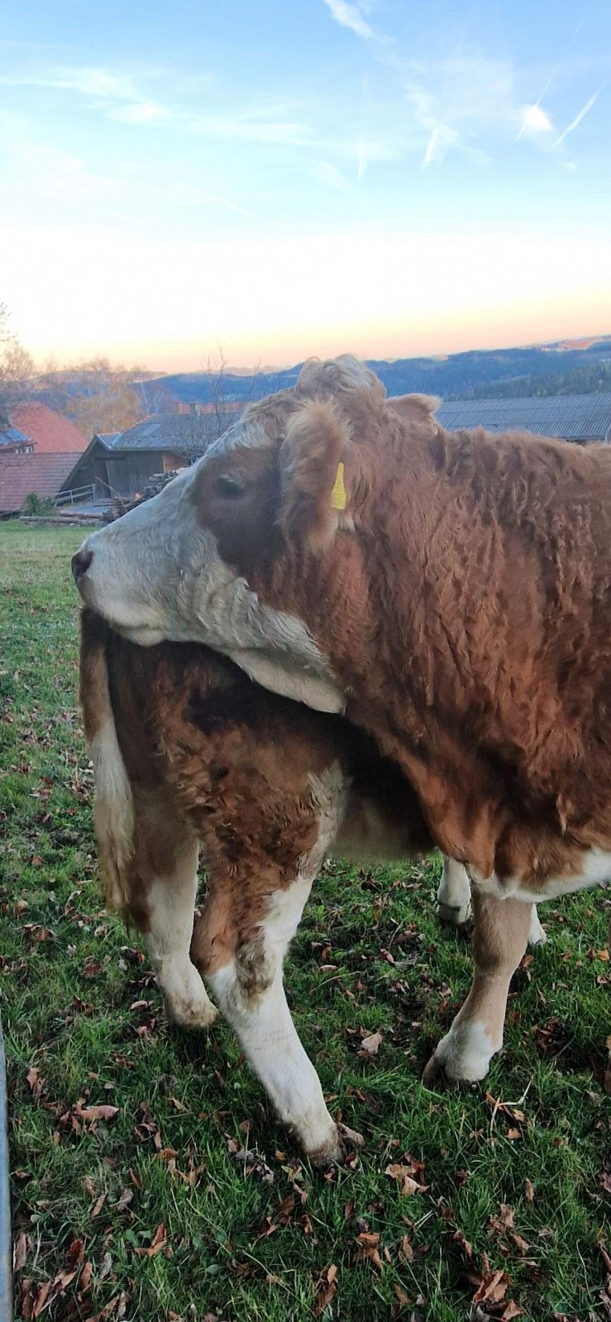Verkaufe zutrauliche, trächtige, genetisch hornlose Bio Fleckvieh Mutterkuh (geboren 02.2023). Abkalbetermin 6.2.2026. Govedo Simental