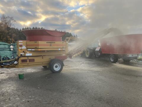 Wir bringen Ihren Mist gerne aufs Feld, Kompoststreuwerk sehr schönes Arbeitsbild, Wurfweite bis zu 15 m. Kmetijske storitve Distribucijo gnojil